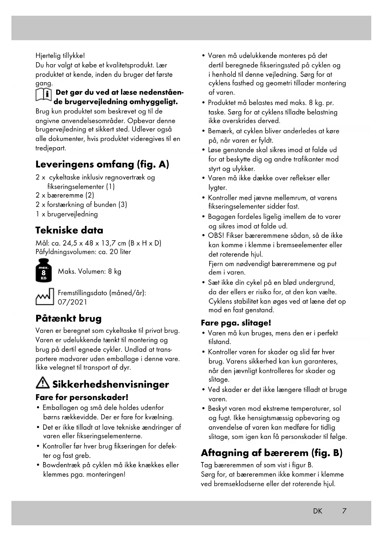 Maks. Volumen: 8 kg Fremstillingsdato (måned/år): 07/2021 Påtænkt brug Varen er beregnet som cykeltaske til privat brug. Varen er udelukkende tænkt til montering og brug på dertil egnede cykler. Undlad at trans- portere madvarer uden emballage i denne vare. Ikke velegnet til transport af dyr. Sikkerhedshenvisninger Fare for personskader!