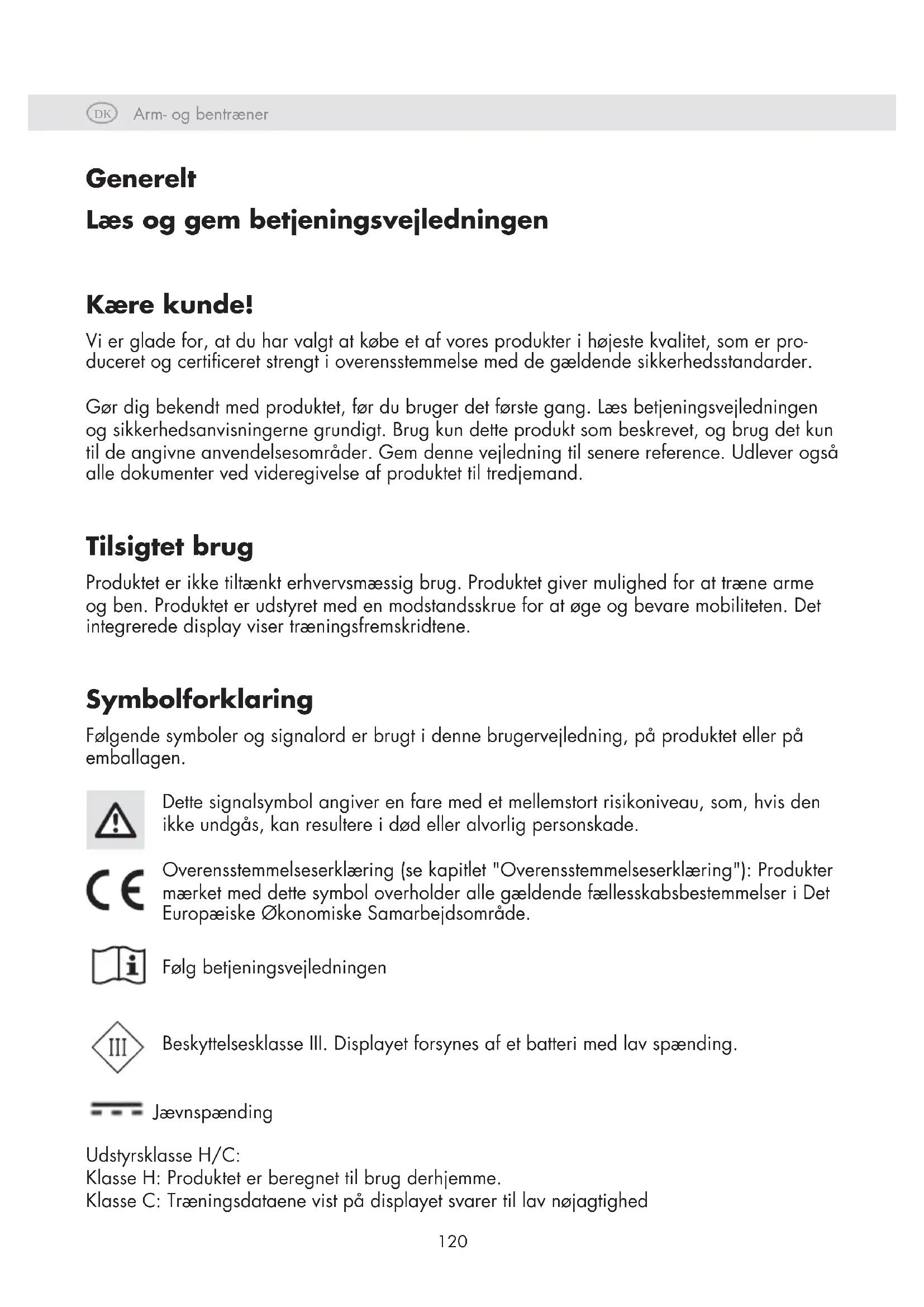 Generelt Læs og gem betjeningsvejledningen Kære kunde! Vi er glade for, at du har valgt at købe et af vores produkter i højeste kvalitet, som er pro- duceret og certiceret strengt i overensstemmelse med de gældende sikkerhedsstandarder. Gør dig bekendt med produktet, før du bruger det første gang. Læs betjeningsvejledningen og sikkerhedsanvisningerne grundigt. Brug kun dette produkt som beskrevet, og brug det kun til de angivne anvendelsesområder. Gem denne vejledning til senere reference. Udlever også alle dokumenter ved videregivelse af produktet til tredjemand. Tilsigtet brug Produktet er ikke tiltænkt erhvervsmæssig brug. Produktet giver mulighed for at træne arme og ben. Produktet er udstyret med en modstandsskrue for at øge og bevare mobiliteten. Det integrerede display viser træningsfremskridtene. Symbolforklaring Følgende symboler og signalord er brugt i denne brugervejledning, på produktet eller på emballagen. Dette signalsymbol angiver en fare med et mellemstort risikoniveau, som, hvis den ikke undgås, kan resultere i død eller alvorlig personskade. Overensstemmelseserklæring (se kapitlet "Overensstemmelseserklæring"): Produkter mærket med dette symbol overholder alle gældende fællesskabsbestemmelser i Det Europæiske Økonomiske Samarbejdsområde. Følg betjeningsvejledningen Beskyttelsesklasse III. Displayet forsynes af et batteri med lav spænding. Jævnspænding Udstyrsklasse H/C: Klasse H: Produktet er beregnet til brug derhjemme. Klasse C: Træningsdataene vist på displayet svarer til lav nøjagtighedDK Arm- og bentræner Arm- og bentræner
