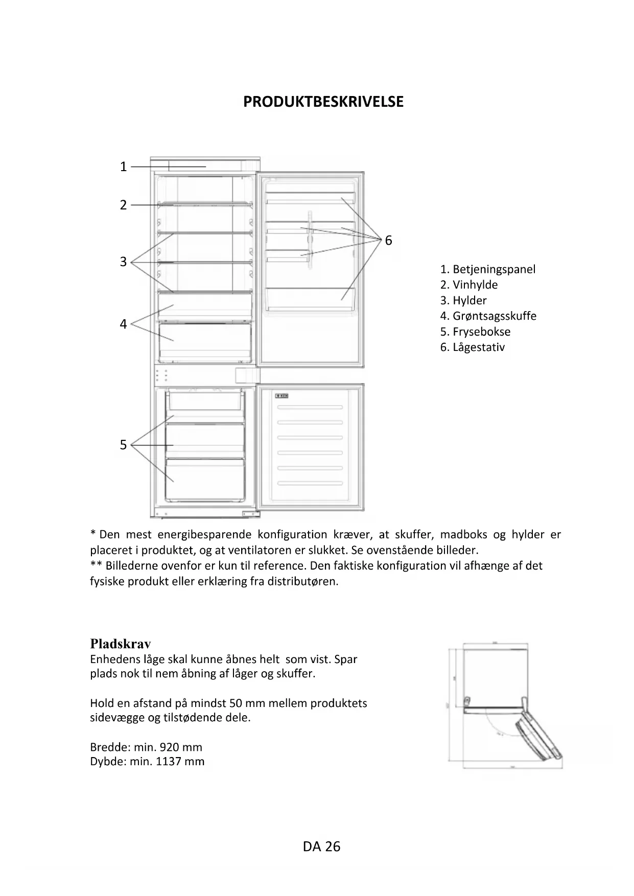 - Den mest energibesparende konfiguration kræver, at skuffer, madboks og hylder erplaceret i produktet, og at ventilatoren er slukket. Se ovenstående billeder.** Billederne ovenfor er kun til reference. Den faktiske konfiguration vil afhænge af detfysiske produkt eller erklæring fra distributøren. Pladskrav Enhedens låge skal kunne åbnes helt som vist. Spar plads nok til nem åbning af låger og skuffer. Hold en afstand på mindst 50 mm mellem produktets sidevægge og tilstødende dele.Bredde: min. 920 mm Dybde: min. 1137 mm1. Betjeningspanel2. Vinhylde3. Hylder4. Grøntsagsskuffe5. Frysebokse6. Lågestativ