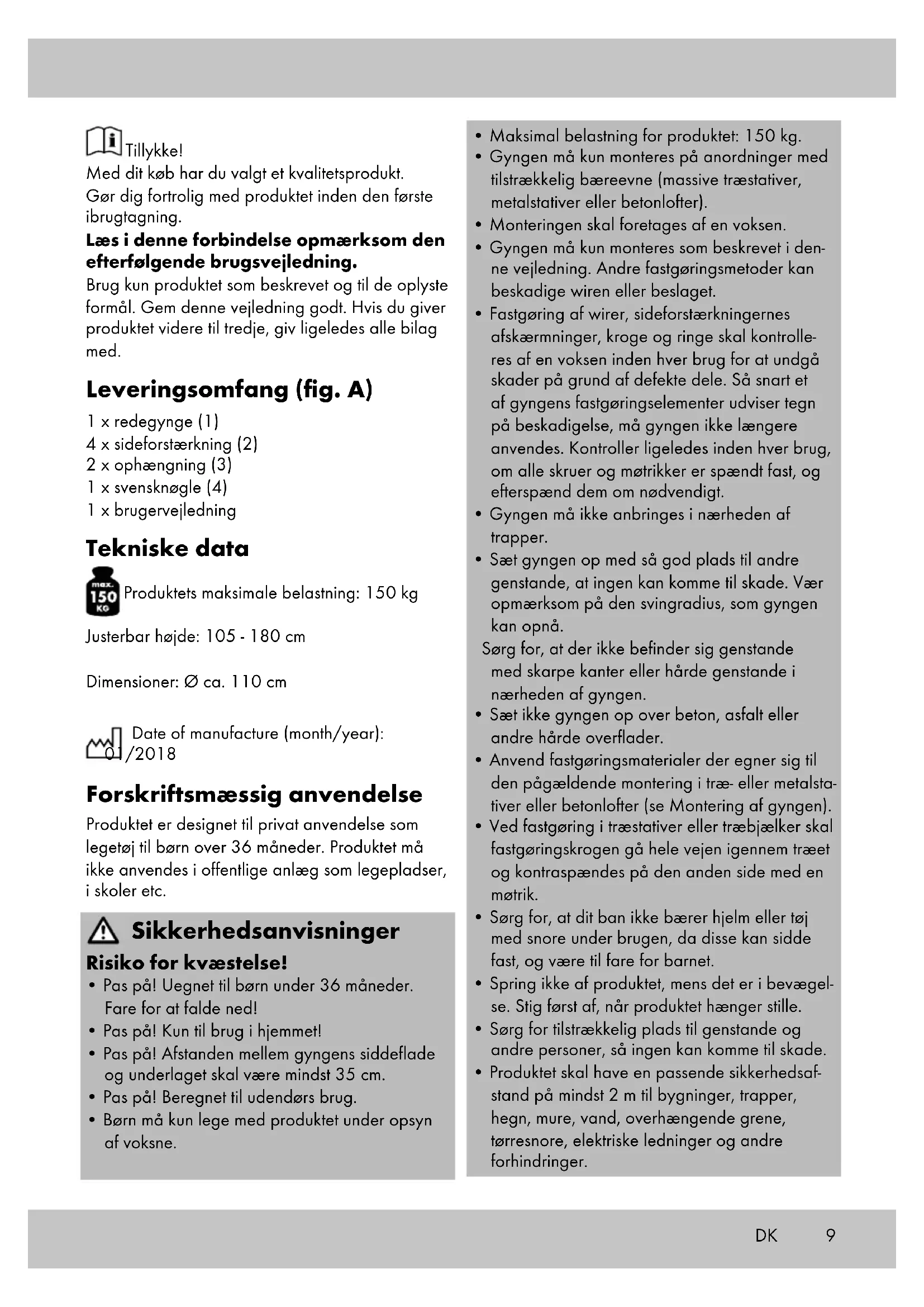 - Produktet skal have en passende sikkerhedsaf- stand på mindst 2 m til bygninger, trapper, hegn, mure, vand, overhængende grene, tørresnore, elektriske ledninger og andre forhindringer. Tillykke! Med dit køb har du valgt et kvalitetsprodukt. Gør dig fortrolig med produktet inden den første ibrugtagning. Læs i denne forbindelse opmærksom den efterfølgende brugsvejledning. Brug kun produktet som beskrevet og til de oplyste formål. Gem denne vejledning godt. Hvis du giver produktet videre til tredje, giv ligeledes alle bilag med. Leveringsomfang (fig. A) 1 x redegynge (1) 4 x sideforstærkning (2) 2 x ophængning (3) 1 x svensknøgle (4) 1 x brugervejledning Tekniske data Produktets maksimale belastning: 150 kg Justerbar højde: 105 - 180 cm Dimensioner: Ø ca. 110 cm Date of manufacture (month/year): 01/2018 Forskriftsmæssig anvendelse Produktet er designet til privat anvendelse som legetøj til børn over 36 måneder. Produktet må ikke anvendes i offentlige anlæg som legepladser, i skoler etc. Sikkerhedsanvisninger Risiko for kvæstelse!