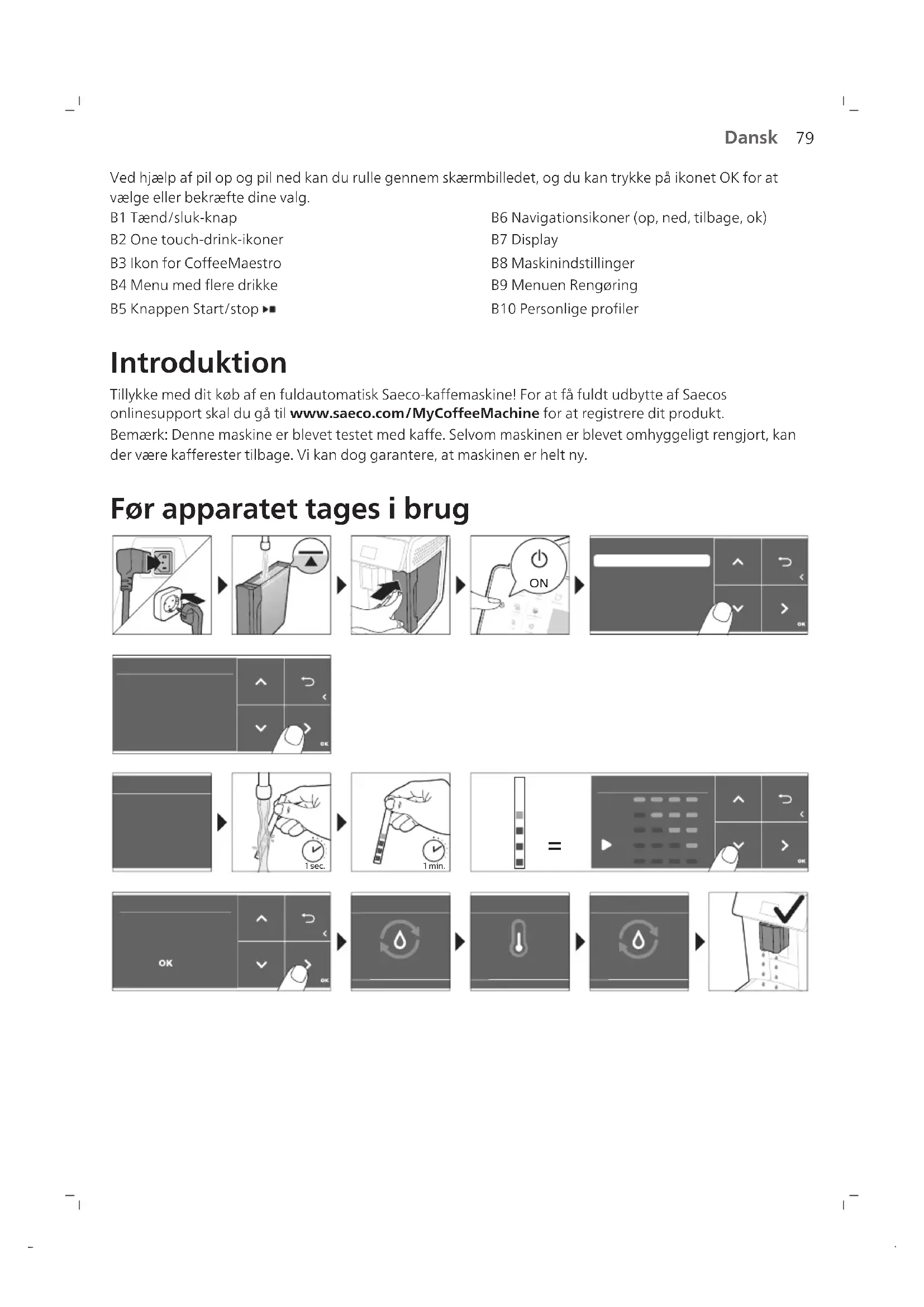 Dansk Indhold Oversigt over maskinen (fig. A) _____________________________________________________________ 78 Betjeningspanel __________________________________________________________________________ 78 Introduktion _____________________________________________________________________________ 79 Før apparatet tages i brug__________________________________________________________________ 79 Særlige funktioner ________________________________________________________________________ 80 Brygning af drikke_________________________________________________________________________ 80 Personlige indstillinger af drikke ____________________________________________________________ 82 Justering af maskinens indstillinger__________________________________________________________ 83 AquaClean-vandfilter _____________________________________________________________________ 84 Udtagning og isætning af bryggeenheden ___________________________________________________ 85 Rengøring og vedligeholdelse ______________________________________________________________ 86 Afkalkningsprocedure _____________________________________________________________________ 89 Fejlkoder_________________________________________________________________________________ 89 Bestilling af tilbehør _______________________________________________________________________ 90 Fejlfinding _______________________________________________________________________________ 91 Tekniske specifikationer ___________________________________________________________________ 95 Oversigt over maskinen (fig. A) A1 Betjeningspanel A2 Låg til beholderen til formalet kaffe A3 Låg til beholderen til kaffebønner A4 Stik til strømkabel A5 Drypbakke A6 Udløsergreb til drypbakke A7 Justerbart udløb til kaffe og mælk A8 HygieSteam-beholder A9 HygieSteam-dæksel med mælkerørsholder A10 Indbygget mælkeopskummer A11 Netledning med stik A12 Knap til formalingsindstilling A13 Beholder til kaffebønner A14 Bryggeenhed A15 Låge A16 Vandtank A17 Kaffegrumsbeholder A18 Frontpanel til kaffegrumsbeholder A19 Dæksel til drypbakke A20 Indikator for "Fyldt drypbakke" Tilbehør A21 Mælkebeholder A22 Mælkerør A23 Rensebørste A24 Smøringsrør A25 AquaClean-filter A26 Måleske A27 Teststrimmel til måling af vandets hårdhedsgrad Betjeningspanel Der er to versioner af denne espressomaskine. Deres betjeningspaneler sker forskellige ud, men alle knapper og ikoner fungerer på samme måde. Se figur B for at få en oversigt over alle knapper og ikoner. Du finder beskrivelsen nedenfor.79 Dansk Ved hjælp af pil op og pil ned kan du rulle gennem skærmbilledet, og du kan trykke på ikonet OK for at vælge eller bekræfte dine valg. B1 Tænd/sluk-knap B2 One touch-drink-ikoner B3 Ikon for CoffeeMaestro B4 Menu med flere drikke B5 Knappen Start/stop B6 Navigationsikoner (op, ned, tilbage, ok) B7 Display B8 Maskinindstillinger B9 Menuen Rengøring B10 Personlige profiler Introduktion Tillykke med dit køb af en fuldautomatisk Saeco-kaffemaskine! For at få fuldt udbytte af Saecos onlinesupport skal du gå til www.saeco.com/MyCoffeeMachine for at registrere dit produkt. Bemærk: Denne maskine er blevet testet med kaffe. Selvom maskinen er blevet omhyggeligt rengjort, kan der være kafferester tilbage. Vi kan dog garantere, at maskinen er helt ny. Før apparatet tages i brug