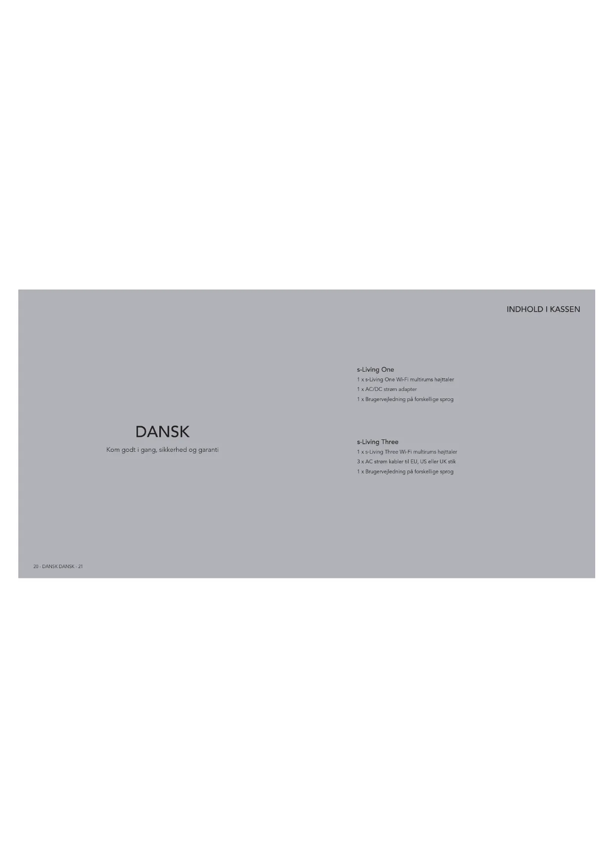 - AUX-In tilstand System LED vil vise GRØN farve. For at benytte højttaleren i Wi-Fi tilstand skal højttaleren være forbundet til et Wi-Fi netværk. Og dette er også nødvendigt hvis man skal benytte funktioner som Google Cast, AirPlay eller Spotify Connect. Højttaleren er ydermere kompatibel med stemme styrings assistenter fra Google og Apple (Google Assistant og Siri), hvis højttaleren samtidig tilknyttes Google Home og/eller Apple Home (Apple Homekit). Højttaleren har IKKE disse stemme styrings assistenter direkte indbygget. Hvis begge LED’er, kort tid efter opstart, begynder at blinke rødt eller hvis man bemærker at de blinker rødt, så er højttaleren i gang med software opdatering. Og man bør IKKE fjerne strømmen til højttaleren mens denne proces er i gang. s-Living One - Bagside s-Living Three - Bagside24 - DANSK DANSK - 25