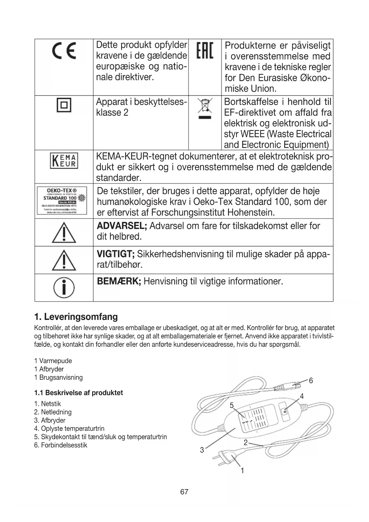 testede kvalitetsprodukter inden for varme, vægt, blodtryk, legemstemperatur, puls, blid terapi, massage, skønhed, luft og baby. Med venlig hilsen Beurer-teamet67 Dette produkt opfylder kravene i de gældende europæiske og natio- nale direktiver. Produkterne er påviseligt i overensstemmelse med kravene i de tekniske regler for Den Eurasiske Økono- miske Union. Apparat i beskyttelses- klasse 2 Bortskaffelse i henhold til EF-direktivet om affald fra elektrisk og elektronisk ud- styr WEEE (Waste Electrical and Electronic Equipment) KEMA-KEUR-tegnet dokumenterer, at et elektroteknisk pro- dukt er sikkert og i overensstemmelse med de gældende standarder. De tekstiler, der bruges i dette apparat, opfylder de høje humanøkologiske krav i Oeko-Tex Standard 100, som der er eftervist af Forschungsinstitut Hohenstein. ADVARSEL; Advarsel om fare for tilskadekomst eller for dit helbred. VIGTIGT; Sikkerhedshenvisning til mulige skader på appa- rat/tilbehør. BEMÆRK; Henvisning til vigtige informationer.