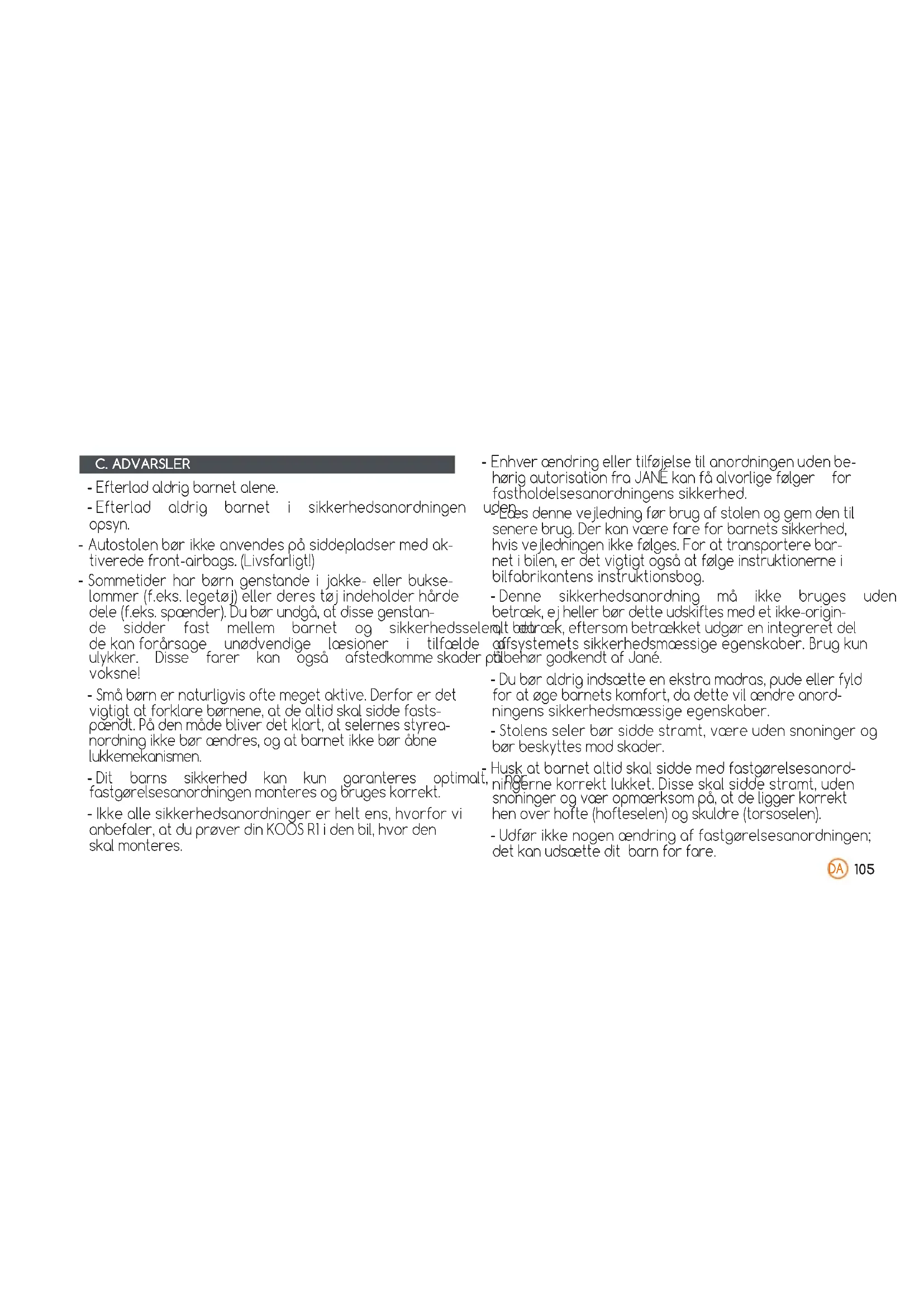 INSTRUKTIONER C. ADVARSLER - Efterladaldrigbarnetalene. - Efterlad aldrig barnet i sikkerhedsanordningen uden opsyn. - Autostolenbørikkeanvendespåsiddepladsermedak- tiveredefront-airbags.(Livsfarligt!) - Sommetiderharbørngenstandeijakke-ellerbukse- lommer(f.eks.legetøj)ellerderestøjindeholderhårde dele(f.eks.spænder).Dubørundgå,atdissegenstan- de sidder fast mellem barnet og sikkerhedsselen, da dekanforårsage unødvendige læsioner i tilfælde af ulykker. Disse farer kan også afstedkommeskaderpå voksne! - Småbørnernaturligvisoftemegetaktive.Derforerdet vigtigtatforklarebørnene,atdealtidskalsiddefasts- pændt.Pådenmådebliverdetklart,atselernesstyrea- nordningikkebørændres,ogatbarnetikkebøråbne lukkemekanismen. - Dit barns sikkerhed kan kun garanteres optimalt, når fastgørelsesanordningenmonteresogbrugeskorrekt. - Ikkeallesikkerhedsanordningererheltens,hvorforvi anbefaler,atduprøverdinKOOSR1idenbil,hvorden skalmonteres. - Enhverændringellertilføjelsetilanordningenudenbe- hørigautorisationfraJANÉkanfåalvorligefølger for fastholdelsesanordningenssikkerhed. - Læsdennevejledningførbrugafstolenoggemdentil senerebrug.Derkanværefareforbarnetssikkerhed, hvisvejledningenikkefølges.Forattransporterebar- netibilen,erdetvigtigtogsåatfølgeinstruktionernei bilfabrikantensinstruktionsbog. - Denne sikkerhedsanordning må ikke bruges uden sit betræk,ejhellerbørdetteudskiftesmedetikke-origin- altbetræk,eftersombetrækketudgørenintegreretdel afsystemetssikkerhedsmæssigeegenskaber.Brugkun tilbehørgodkendtafJané. - Dubøraldrigindsætteenekstramadras,pudeellerfyld foratøgebarnetskomfort,dadettevilændreanord- ningenssikkerhedsmæssigeegenskaber. - Stolensselerbørsiddestramt,væreudensnoningerog børbeskyttesmodskader. - Huskatbarnetaltidskalsiddemedfastgørelsesanord- ningernekorrektlukket.Disseskalsiddestramt,uden snoningerogværopmærksompå,atdeliggerkorrekt henoverhofte(hofteselen)ogskuldre(torsoselen). - Udførikkenogenændringaffastgørelsesanordningen; detkanudsætteditbarnforfare.DA