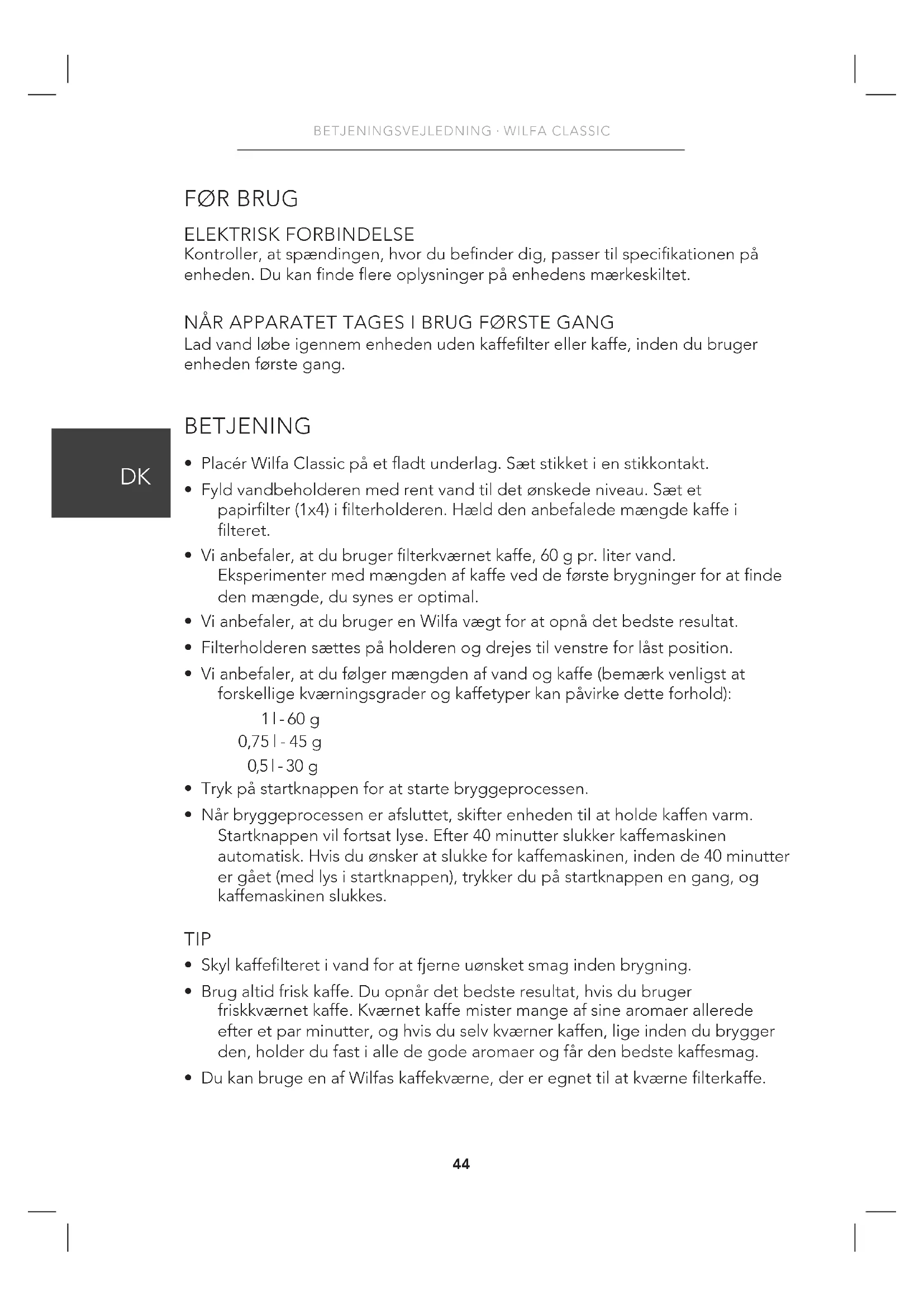 GARANTI Wilfa yder 5 års garanti på dette produkt fra købsdagen. Garantien dækker produktionsfejl eller mangler, der opstår i garantiperioden. Din kvittering fungerer som dokumentation over for forhandleren, hvis du ønsker at benytte din garanti. Garantien gælder kun for produkter, der er købt til og bruges i private husstande. Garantien gælder ikke, hvis produktet bruges kommercielt. Garantien gælder ikke, hvis produktet er misbrugt, forsømt, vejledningen fra Wilfa ikke er fulgt, produktet er ændret, eller der er foretaget uautoriseret reparation. Garantien gælder heller ikke for normalt slid på produktet, misbrug, manglende vedligeholdelse, brug af forkert spænding eller: