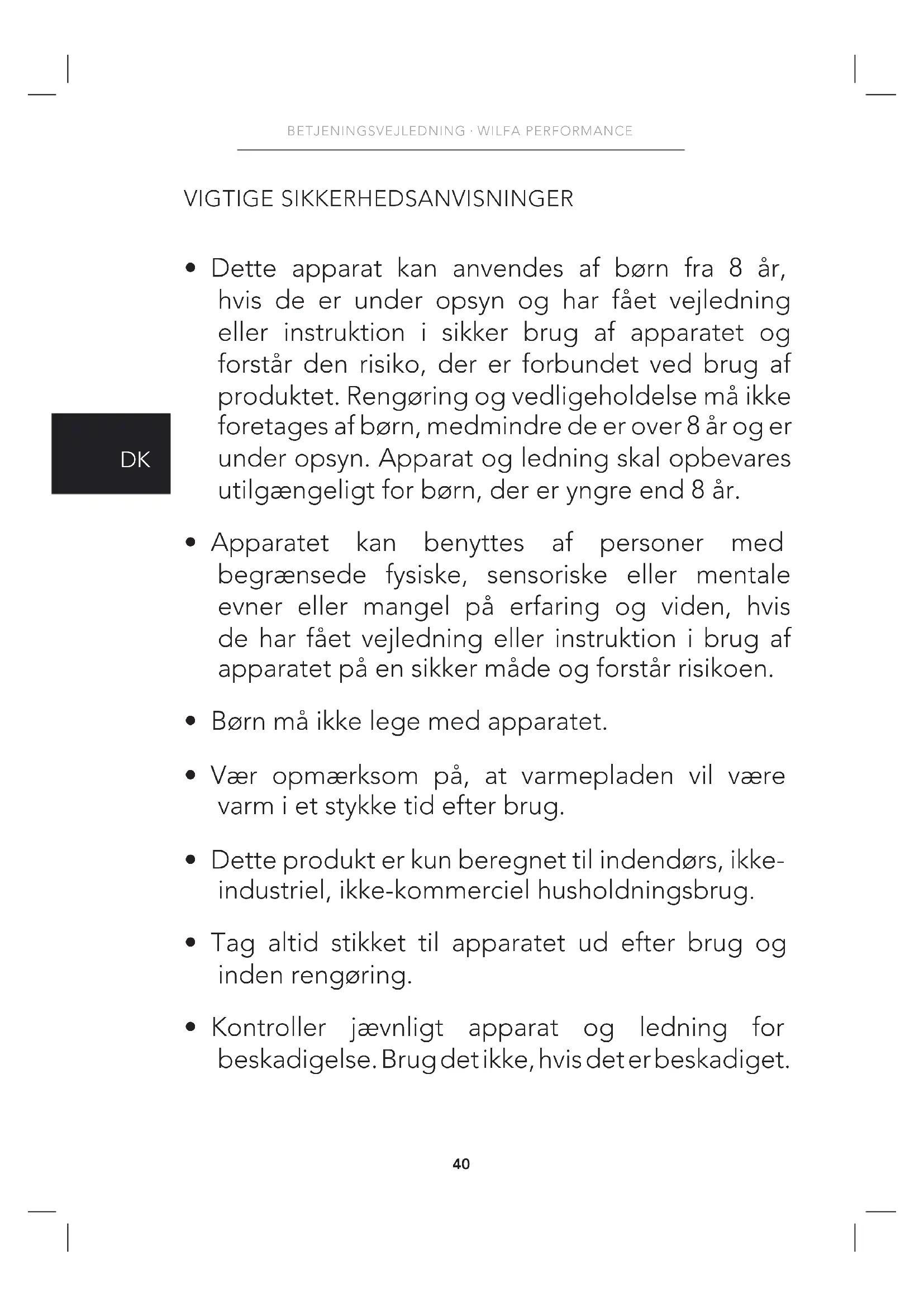 - Dette apparat kan anvendes af børn fra 8 år, hvis de er under opsyn og har fået vejledning eller instruktion i sikker brug af apparatet og forstår den risiko, der er forbundet ved brug af produktet. Rengøring og vedligeholdelse må ikke foretages af børn, medmindre de er over 8 år og er under opsyn. Apparat og ledning skal opbevares utilgængeligt for børn, der er yngre end 8 år.
