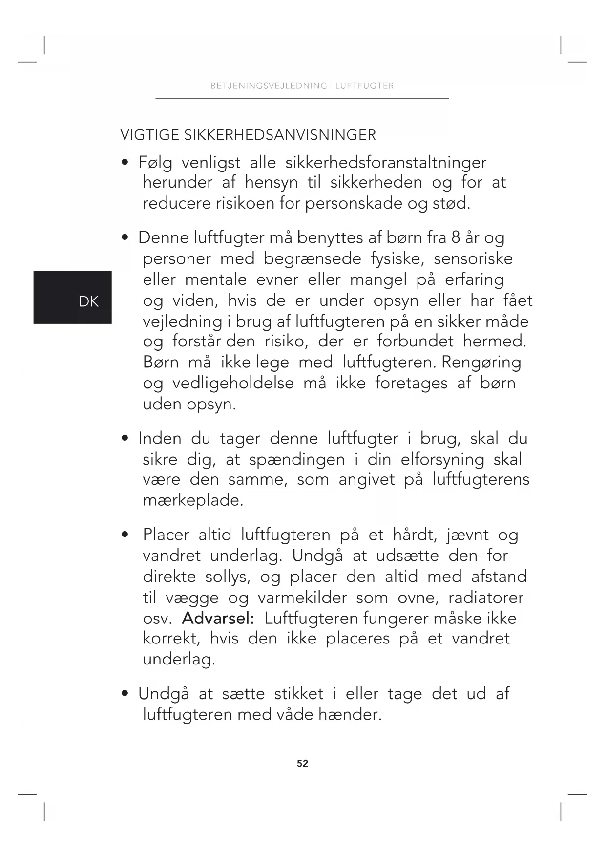 - Denne luftfugter må benyttes af børn fra 8 år og personer med begrænsede fysiske, sensoriske eller mentale evner eller mangel på erfaring og viden, hvis de er under opsyn eller har fået vejledning i brug af luftfugteren på en sikker måde og forstår den risiko, der er forbundet hermed. Børn må ikke lege med luftfugteren. Rengøring og vedligeholdelse må ikke foretages af børn uden opsyn.