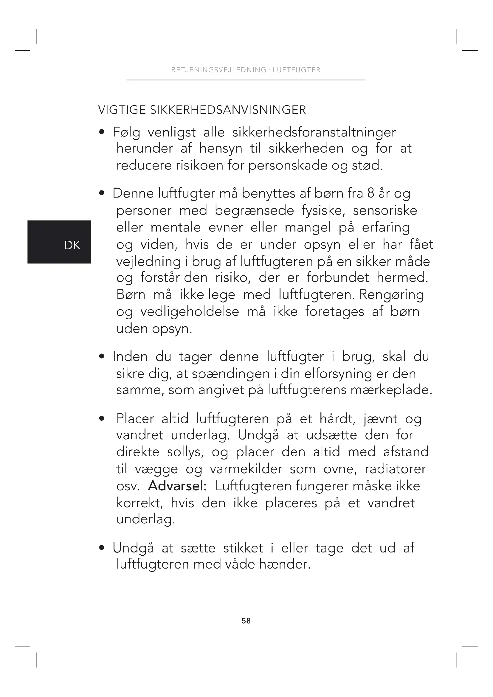 - Denne luftfugter må benyttes af børn fra 8 år og personer med begrænsede fysiske, sensoriske eller mentale evner eller mangel på erfaring og viden, hvis de er under opsyn eller har fået vejledning i brug af luftfugteren på en sikker måde og forstår den risiko, der er forbundet hermed. Børn må ikke lege med luftfugteren. Rengøring og vedligeholdelse må ikke foretages af børn uden opsyn.