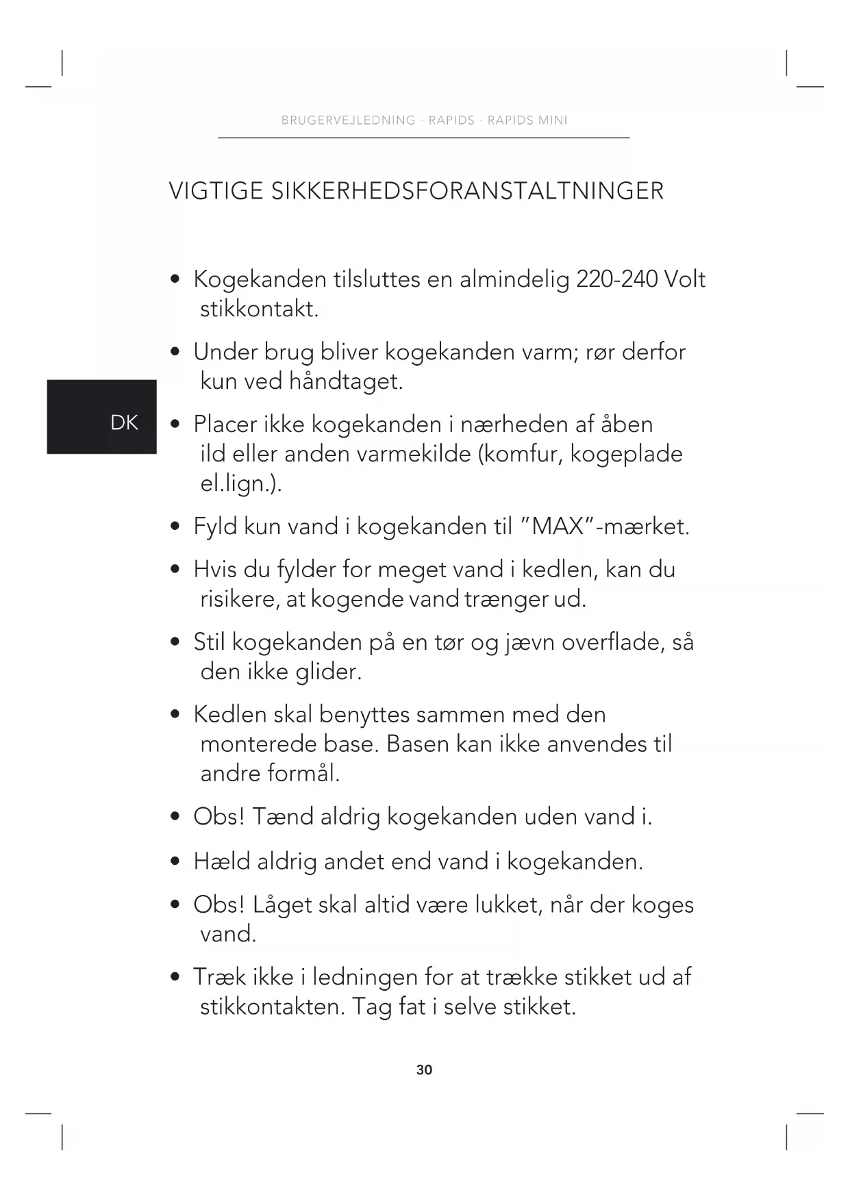 - Obs! Tænd aldrig kogekanden uden vand i.