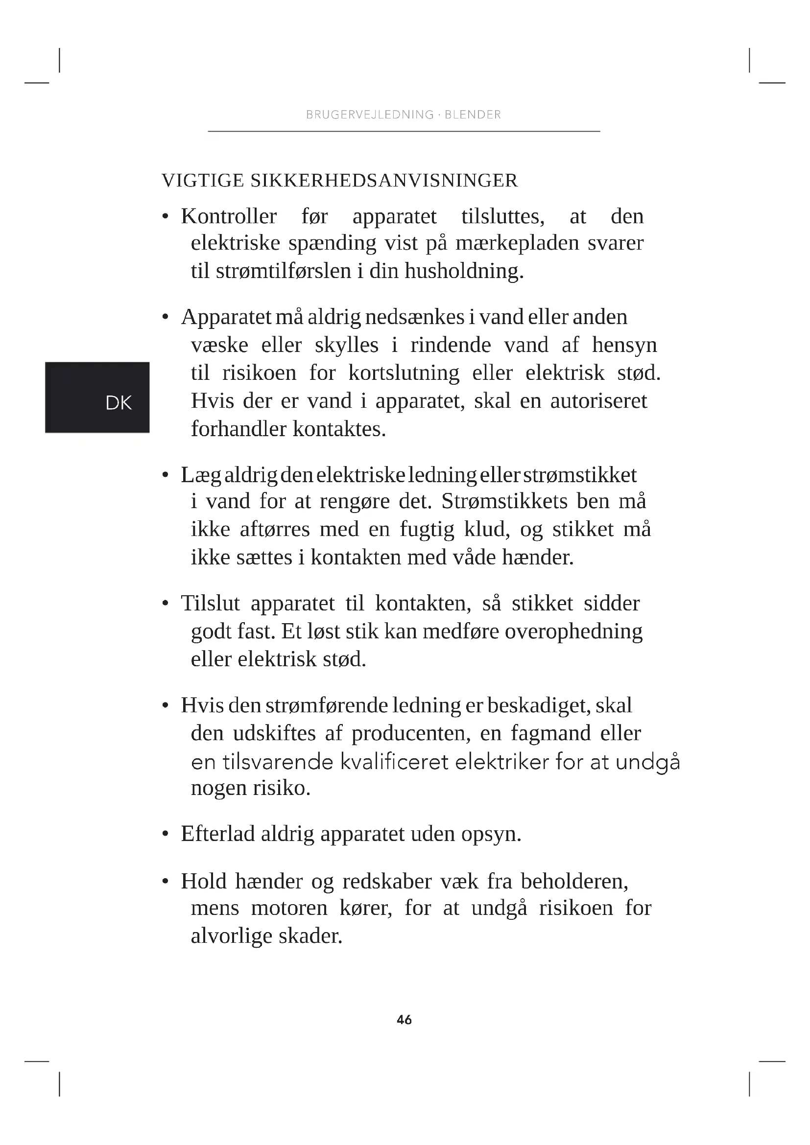 - Læg aldrig den elektriske ledning eller strømstikket i vand for at rengøre det. Strømstikkets ben må ikke aftørres med en fugtig klud, og stikket må ikke sættes i kontakten med våde hænder.