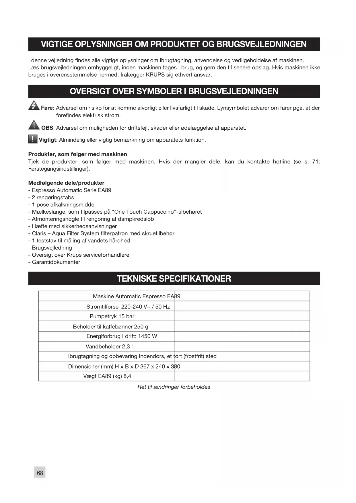 Vigtigt: Almindelig eller vigtig bemærkning om apparatets funktion. Produkter, som følger med maskinen Tjek de produkter, som følger med maskinen. Hvis der mangler dele, kan du kontakte hotline (se s. 71: Førstegangsindstillinger). Medfølgende dele/produkter - Espresso Automatic Serie EA89 - 2 rengøringstabs - 1 pose afkalkningsmiddel - Mælkeslange, som tilpasses på “One Touch Cappuccino”-tilbehøret - Afmonteringsnøgle til rengøring af dampkredsløb - Hæfte med sikkerhedsanvisninger - Claris – Aqua Filter System lterpatron med skruetilbehør - 1 teststav til måling af vandets hårdhed - Brugsvejledning - Oversigt over Krups serviceforhandlere - Garantidokumenter TEKNISKE SPECIFIKATIONER Maskine Automatic Espresso EA89 Strømtilførsel 220-240 V~ / 50 Hz Pumpetryk 15 bar Beholder til kaffebønner 250 g Energiforbrug I drift: 1450 W Vandbeholder 2,3 l Ibrugtagning og opbevaring Indendørs, et tørt (frostfrit) sted Dimensioner (mm) H x B x D 367 x 240 x 380 Vægt EA89 (kg) 8,4 Ret til ændringer forbeholdes69