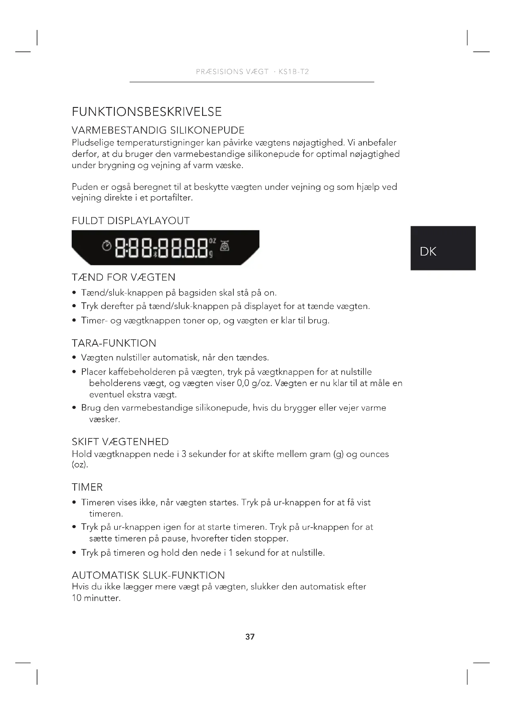 - Tryk på timeren og hold den nede i 1 sekund for at nulstille. AUTOMATISK SLUK-FUNKTION Hvis du ikke lægger mere vægt på vægten, slukker den automatisk efter 10 minutter.38