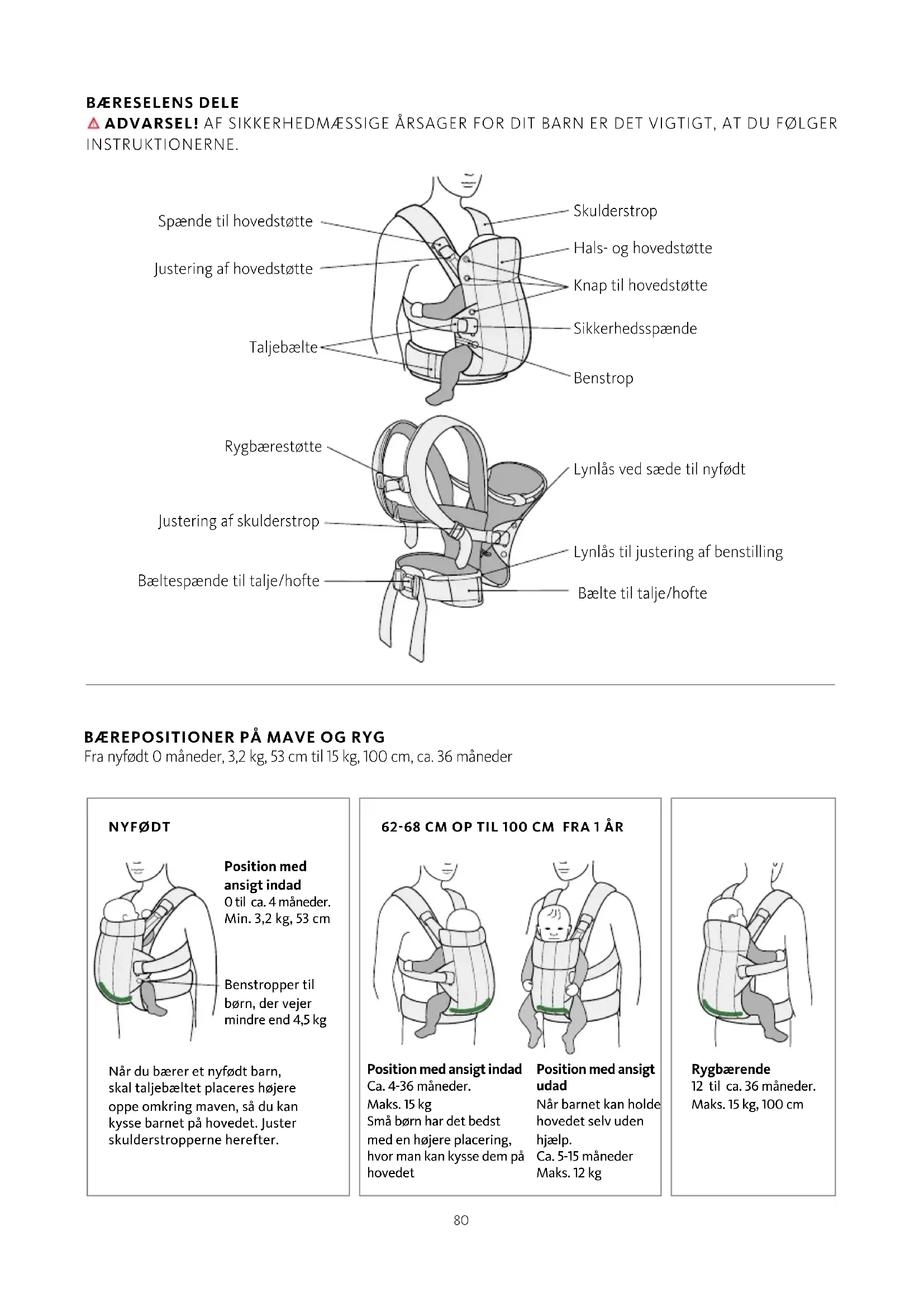 Fra nyfødt 0 måneder, 3,2 kg, 53 cm til 15 kg, 100 cm, ca. 36 måneder Position med ansigt udad Når barnet kan holde hovedet selv uden hjælp. Ca. 5-15 måneder Maks. 12 kg Rygbærende 12 til ca. 36 måneder. Maks. 15 kg, 100 cm Position med ansigt indad Ca. 4-36 måneder. Maks. 15 kg Små børn har det bedst med en højere placering, hvor man kan kysse dem på hovedet Spænde til hovedstøtte Taljebælte Skulderstrop Hals- og hovedstøtte Knap til hovedstøtte Sikkerhedsspænde Benstrop Rygbærestøtte Bæltespænde til talje/hofte Justering af skulderstrop Lynlås til justering af benstilling Bælte til talje/hofte Lynlås ved sæde til nyfødt Justering af hovedstøtte NYFØDT Når du bærer et nyfødt barn, skal taljebæltet placeres højere oppe omkring maven, så du kan kysse barnet på hovedet. Juster skulderstropperne herefter. Position med ansigt indad 0 til ca. 4 måneder. Min. 3,2 kg, 53 cm Benstropper til børn, der vejer mindre end 4,5 kg