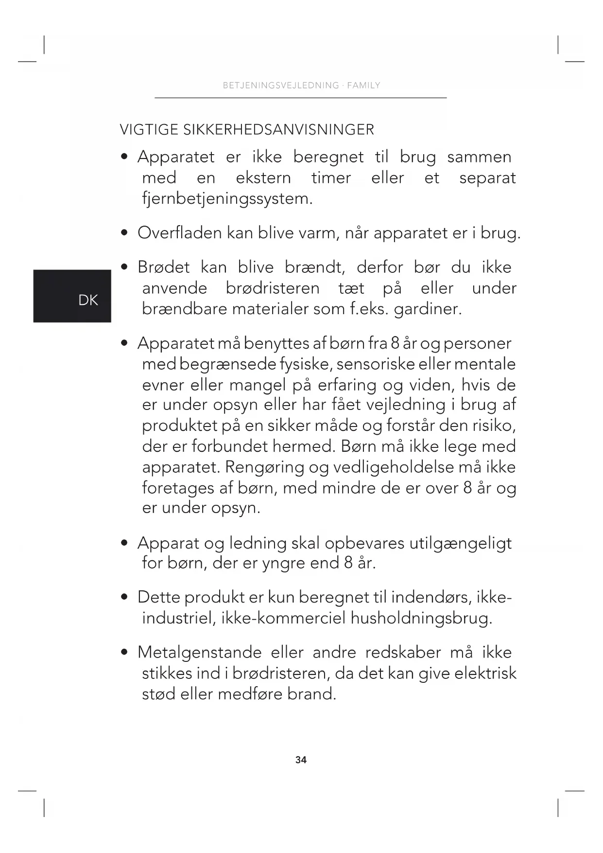 - Metalgenstande eller andre redskaber må ikke stikkes ind i brødristeren, da det kan give elektrisk stød eller medføre brand.35