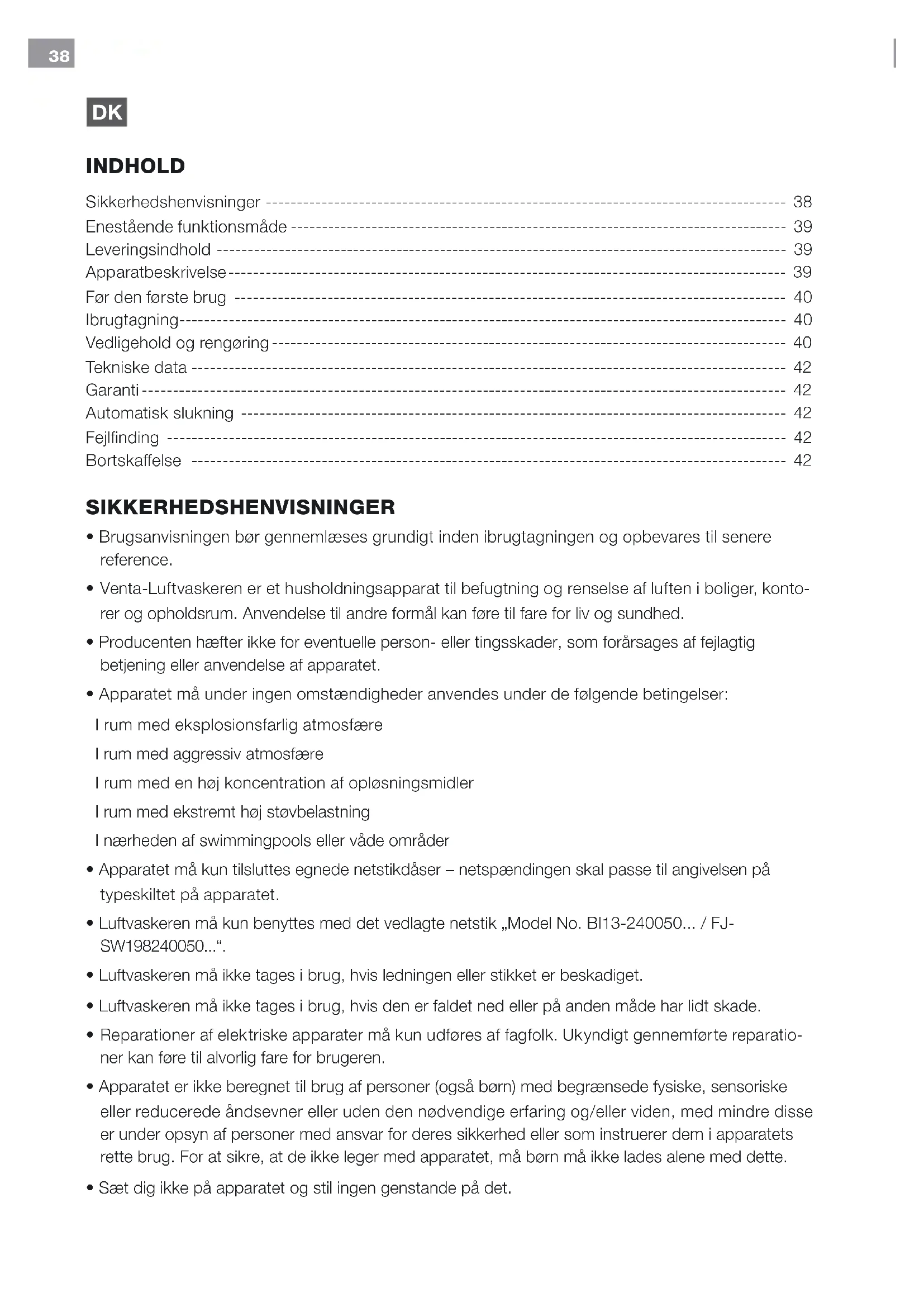 - Luftvaskeren må kun benyttes med det vedlagte netstik „Model No. BI13-240050... / FJ- SW198240050...“.