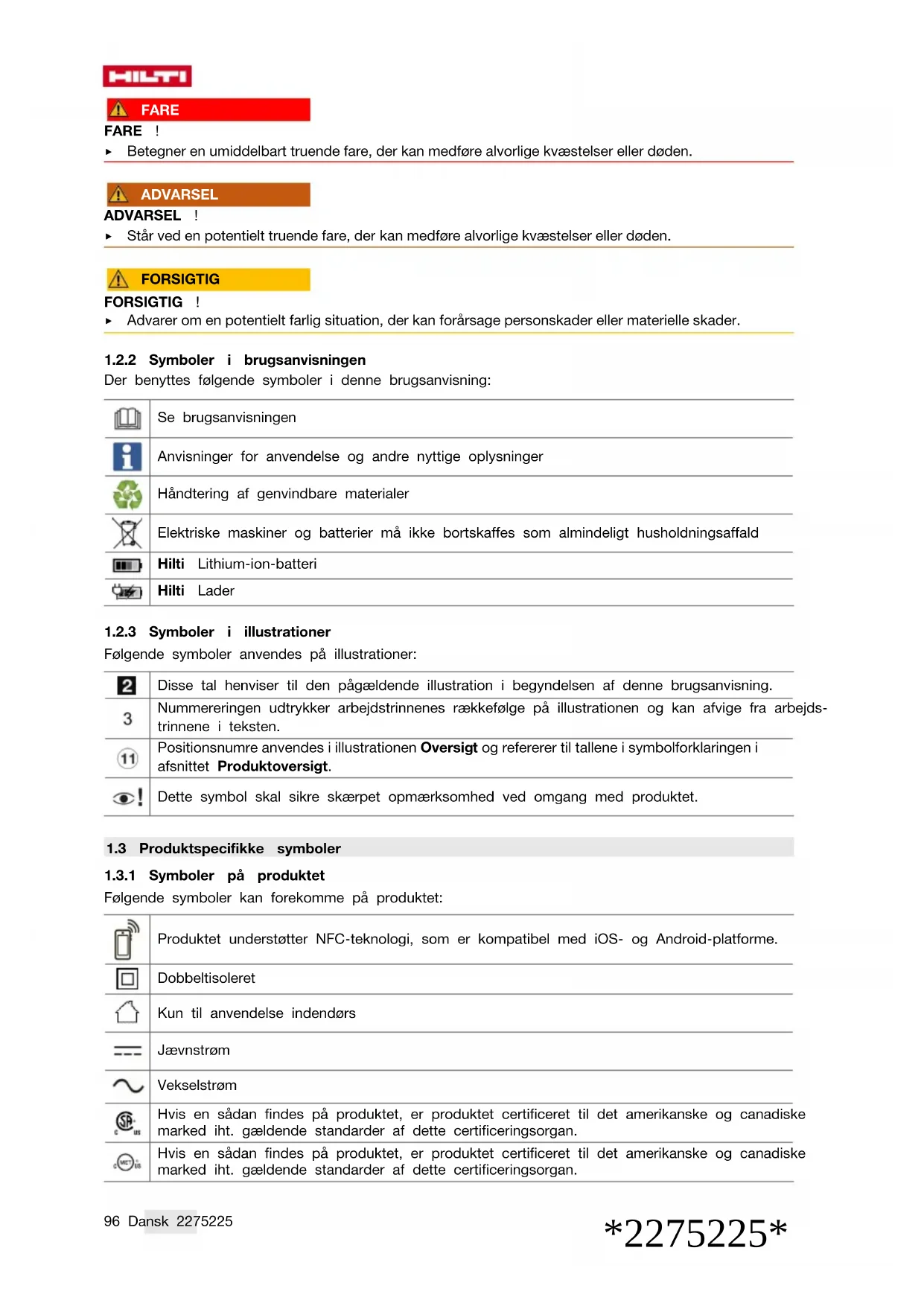 Der benyttes følgende symboler i denne brugsanvisning: Se brugsanvisningen Anvisninger for anvendelse og andre nyttige oplysninger Håndtering af genvindbare materialer Elektriske maskiner og batterier må ikke bortskaffes som almindeligt husholdningsaffald Hilti Lithium-ion-batteri Hilti Lader