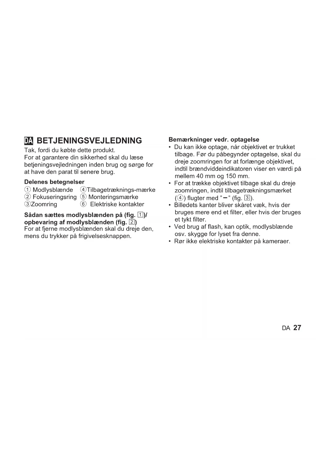 - Rør ikke elektriske kontakter på kameraer. DA28 DA Tekniske data Bajonet : Micro Four Thirds-fatning Brændvidde : 40 mm – 150 mm (svarende til 80 mm – 300 mm med et 35 mm-kamera) Lysstyrke : F4.0 Synsvinkel : 30° – 8,2° Opbygning : 9 grupper, 15 linser Blændeområde : F4.0 til F22 Arbejdsområde : 0,7 m til ) (uendelig) Fokusering : Skift mellem AF/MF Mål : ⌀ 68,9 mm (maksimal diameter) × 99,4 mm (længde) Vægt : 382 g (modlysblænde og dæksel) Filterstørrelse : ⌀ 62 mm Modlysblænde : Bajonet