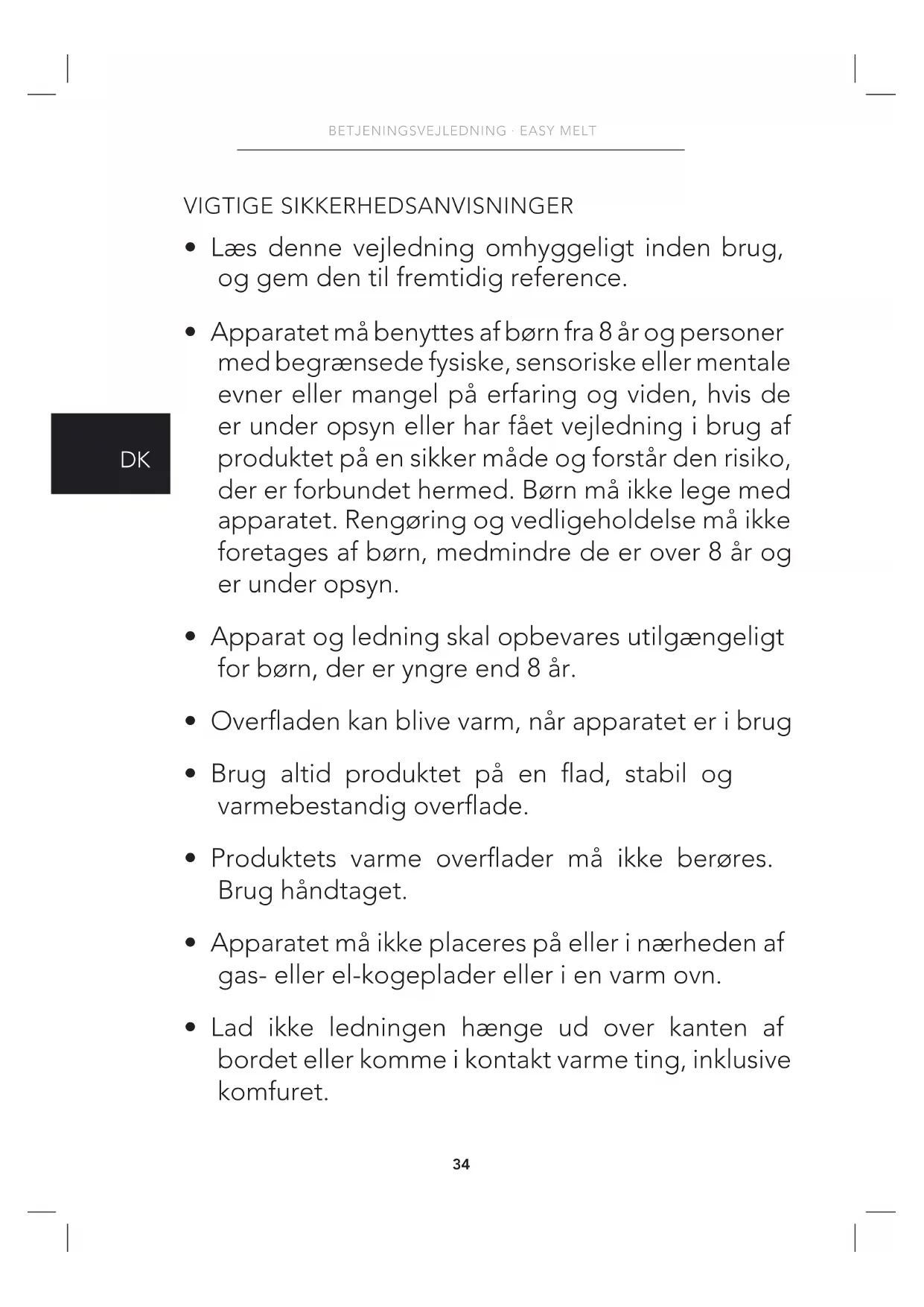 - Lad ikke ledningen hænge ud over kanten af bordet eller komme i kontakt varme ting, inklusive komfuret.35