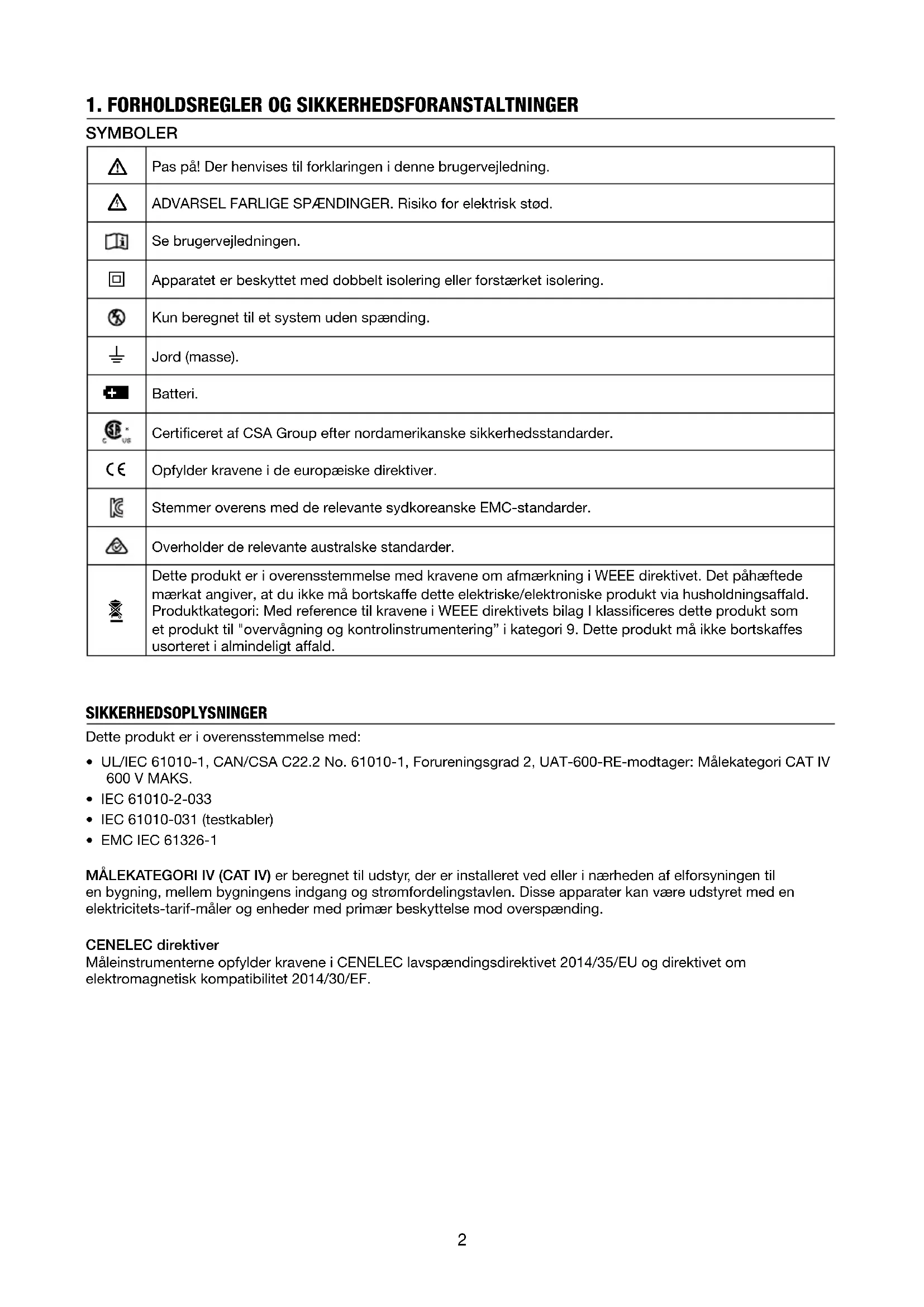 - EMC IEC 61326-1 MÅLEKATEGORI IV (CAT IV) er beregnet til udstyr, der er installeret ved eller i nærheden af elforsyningen til en bygning, mellem bygningens indgang og strømfordelingstavlen. Disse apparater kan være udstyret med en elektricitets-tarif-måler og enheder med primær beskyttelse mod overspænding. CENELEC direktiver Måleinstrumenterne opfylder kravene i CENELEC lavspændingsdirektivet 2014/35/EU og direktivet om elektromagnetisk kompatibilitet 2014/30/EF.3 Advarsler: Læs inden ibrugtagning For at undgå elektrisk stød eller kvæstelser: