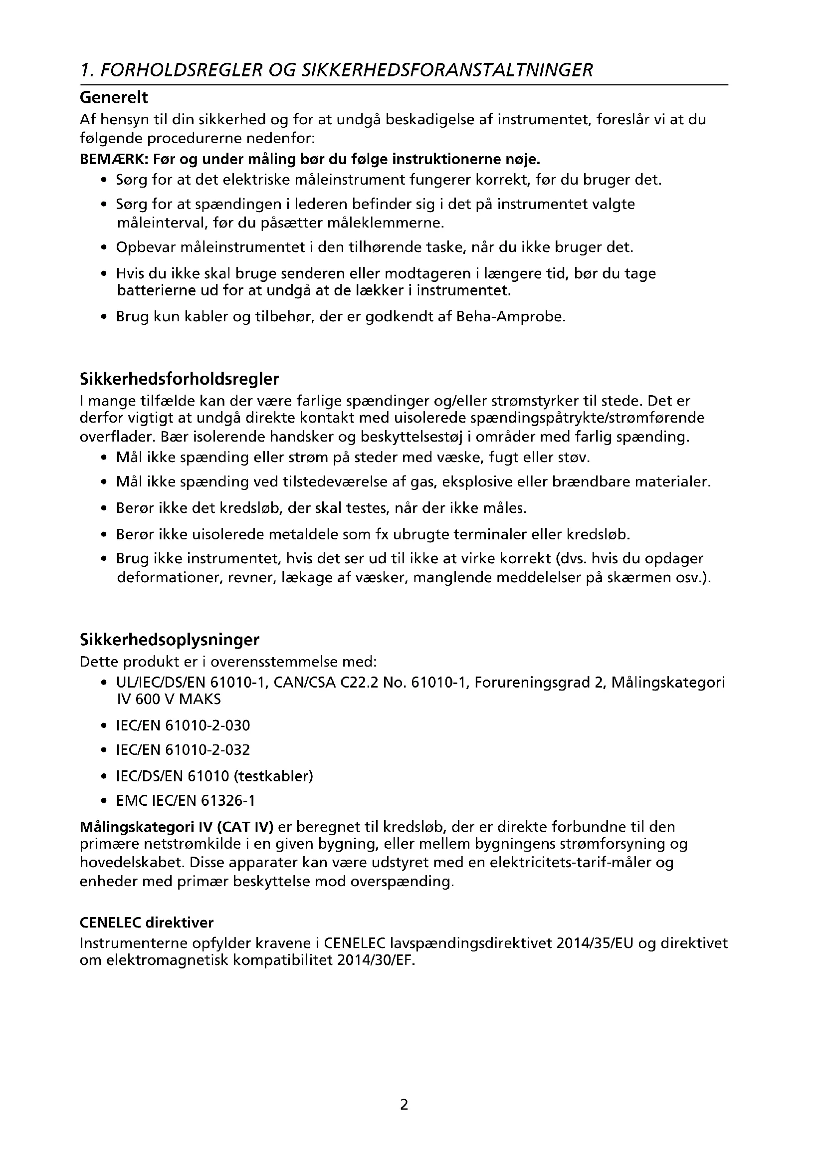 - EMC IEC/EN 61326-1 Målingskategori IV (CAT IV) er beregnet til kredsløb, der er direkte forbundne til den primære netstrømkilde i en given bygning, eller mellem bygningens strømforsyning og hovedelskabet. Disse apparater kan være udstyret med en elektricitets-tarif-måler og enheder med primær beskyttelse mod overspænding. CENELEC direktiver Instrumenterne opfylder kravene i CENELEC lavspændingsdirektivet 2014/35/EU og direktivet om elektromagnetisk kompatibilitet 2014/30/EF.3 Advarsler: Læs inden ibrugtagning For at undgå elektrisk stød eller kvæstelser: