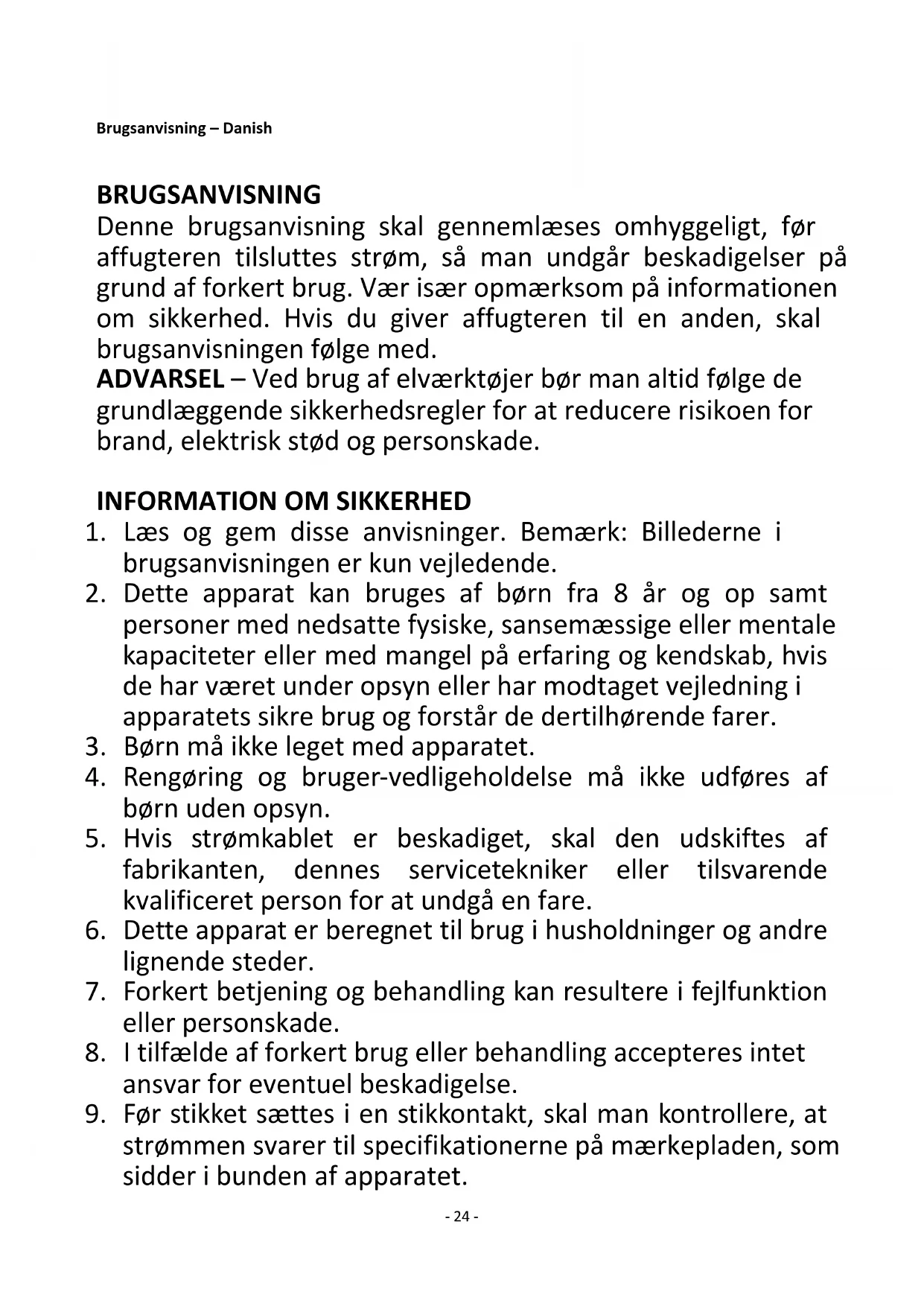 Pokud jde o informování spotřebitelů o tom, jak instalovat, používat a udržovat výrobek a informace o OEEZ, viz návod k obsluze dodaný s balením.- 24 - Brugsanvisning – Danish BRUGSANVISNING Denne brugsanvisning skal gennemlæses omhyggeligt, før affugteren tilsluttes strøm, så man undgår beskadigelser på grund af forkert brug. Vær især opmærksom på informationen om sikkerhed. Hvis du giver affugteren til en anden, skal brugsanvisningen følge med. ADVARSEL – Ved brug af elværktøjer bør man altid følge de grundlæggende sikkerhedsregler for at reducere risikoen for brand, elektrisk stød og personskade.