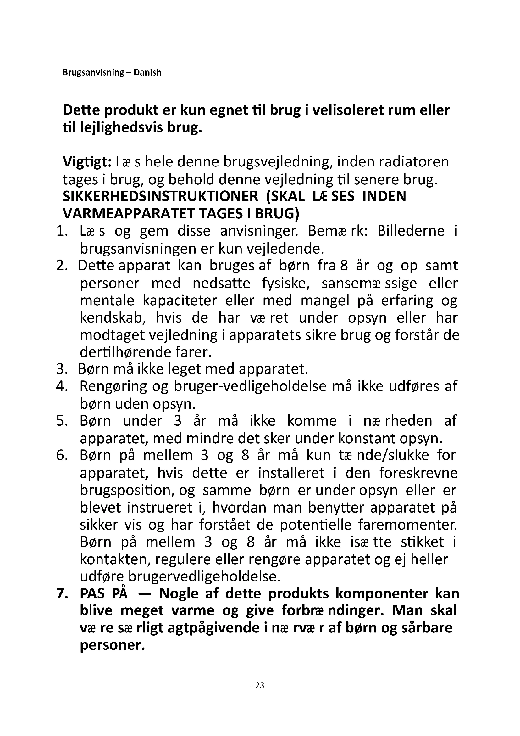 23. Hvis ledningen beskadiges, må radiatoren ikke bruges.