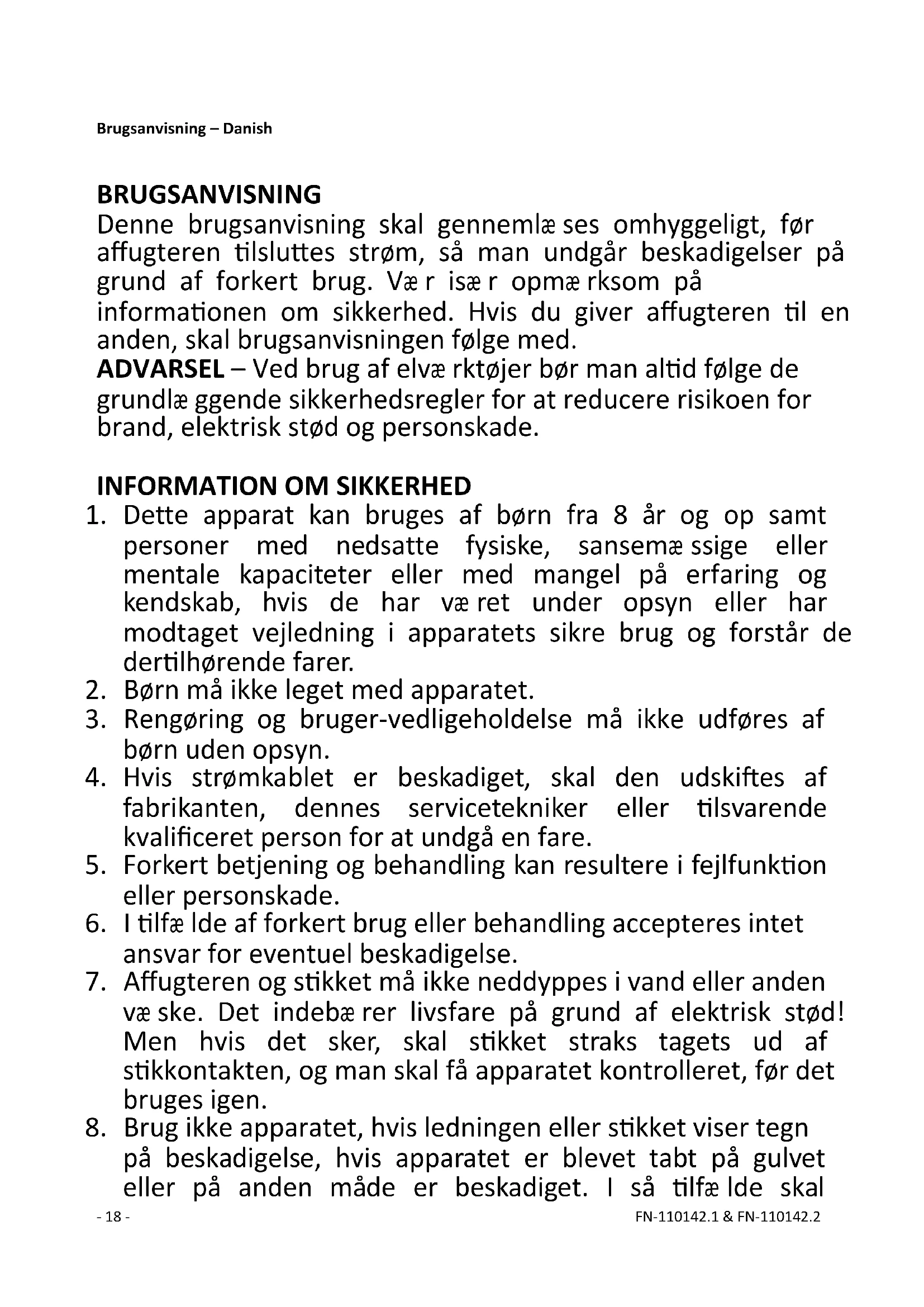 på beskadigelse, hvis apparatet er blevet tabt på gulvet eller på anden måde er beskadiget. I så tilfæ lde skal- 19 - FN-110142.1 & FN-110142.2 apparatet tages med til en autoriseret el-installatør, som kan kontrollere og om nødvendigt reparere det.