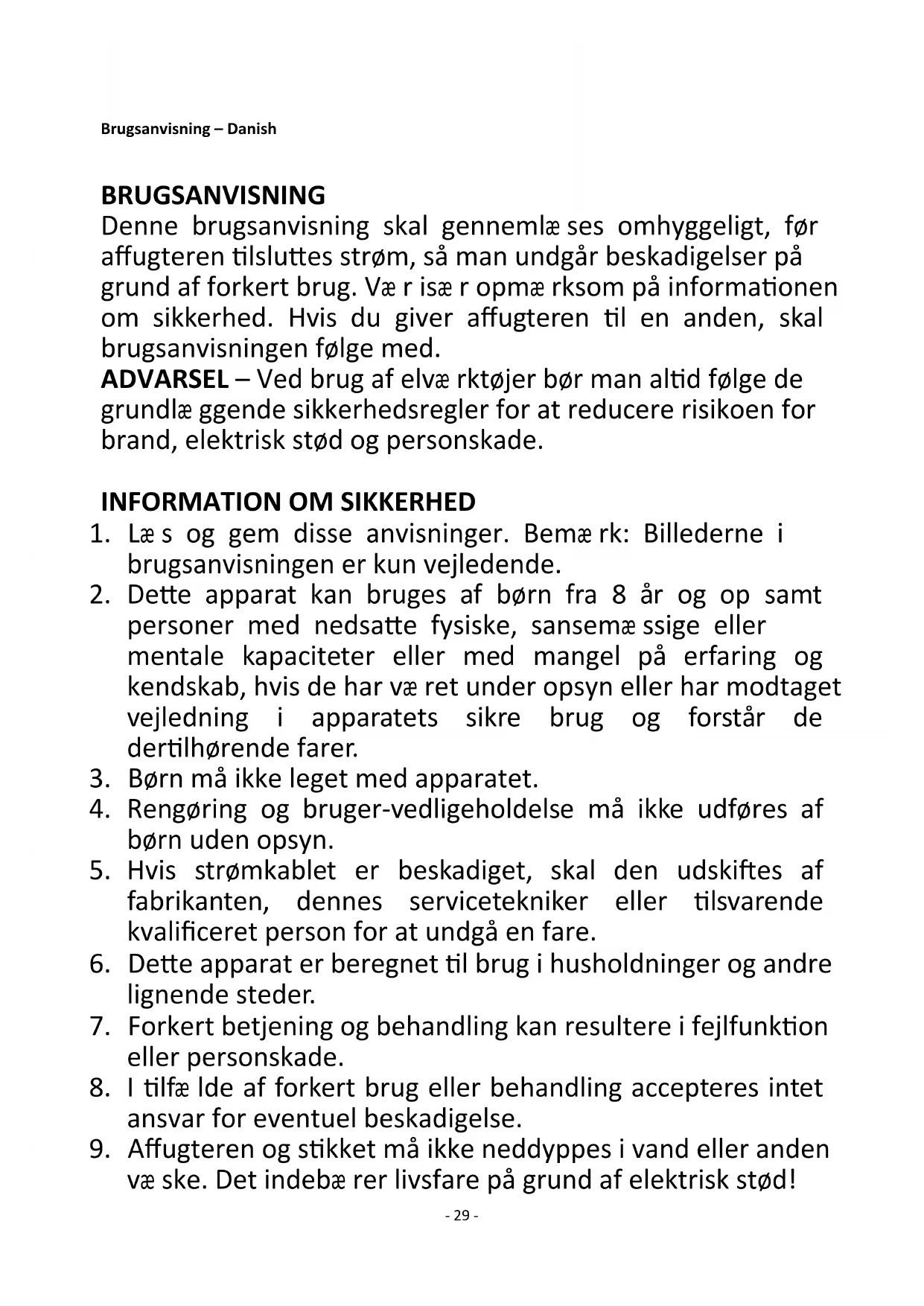 Pokud jde o informování spotřebitelů o tom, jak instalovat, používat a udržovat výrobek a informace o OEEZ, viz návod k obsluze dodaný s balením.- 29 - Brugsanvisning – Danish BRUGSANVISNING Denne brugsanvisning skal gennemlæ ses omhyggeligt, før affugteren tilsluttes strøm, så man undgår beskadigelser på grund af forkert brug. Væ r isæ r opmæ rksom på informationen om sikkerhed. Hvis du giver affugteren til en anden, skal brugsanvisningen følge med. ADVARSEL – Ved brug af elvæ rktøjer bør man altid følge de grundlæ ggende sikkerhedsregler for at reducere risikoen for brand, elektrisk stød og personskade.