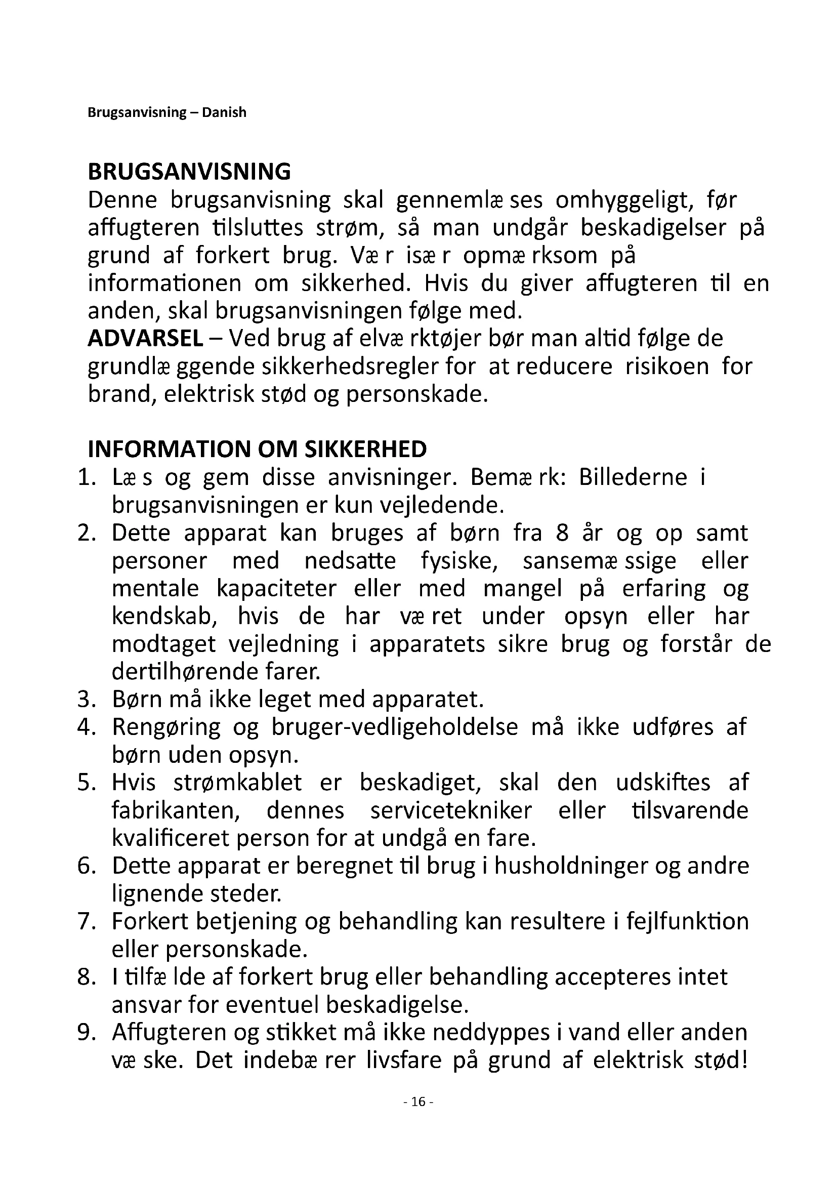 Pokud jde o informování spotřebitelů o tom, jak instalovat, používat a udržovat výrobek a informace o OEEZ, viz návod k obsluze dodaný s balením.- 16 - Brugsanvisning – Danish BRUGSANVISNING Denne brugsanvisning skal gennemlæ ses omhyggeligt, før affugteren tilsluttes strøm, så man undgår beskadigelser på grund af forkert brug. Væ r isæ r opmæ rksom på informationen om sikkerhed. Hvis du giver affugteren til en anden, skal brugsanvisningen følge med. ADVARSEL – Ved brug af elvæ rktøjer bør man altid følge de grundlæ ggende sikkerhedsregler for at reducere risikoen for brand, elektrisk stød og personskade.
