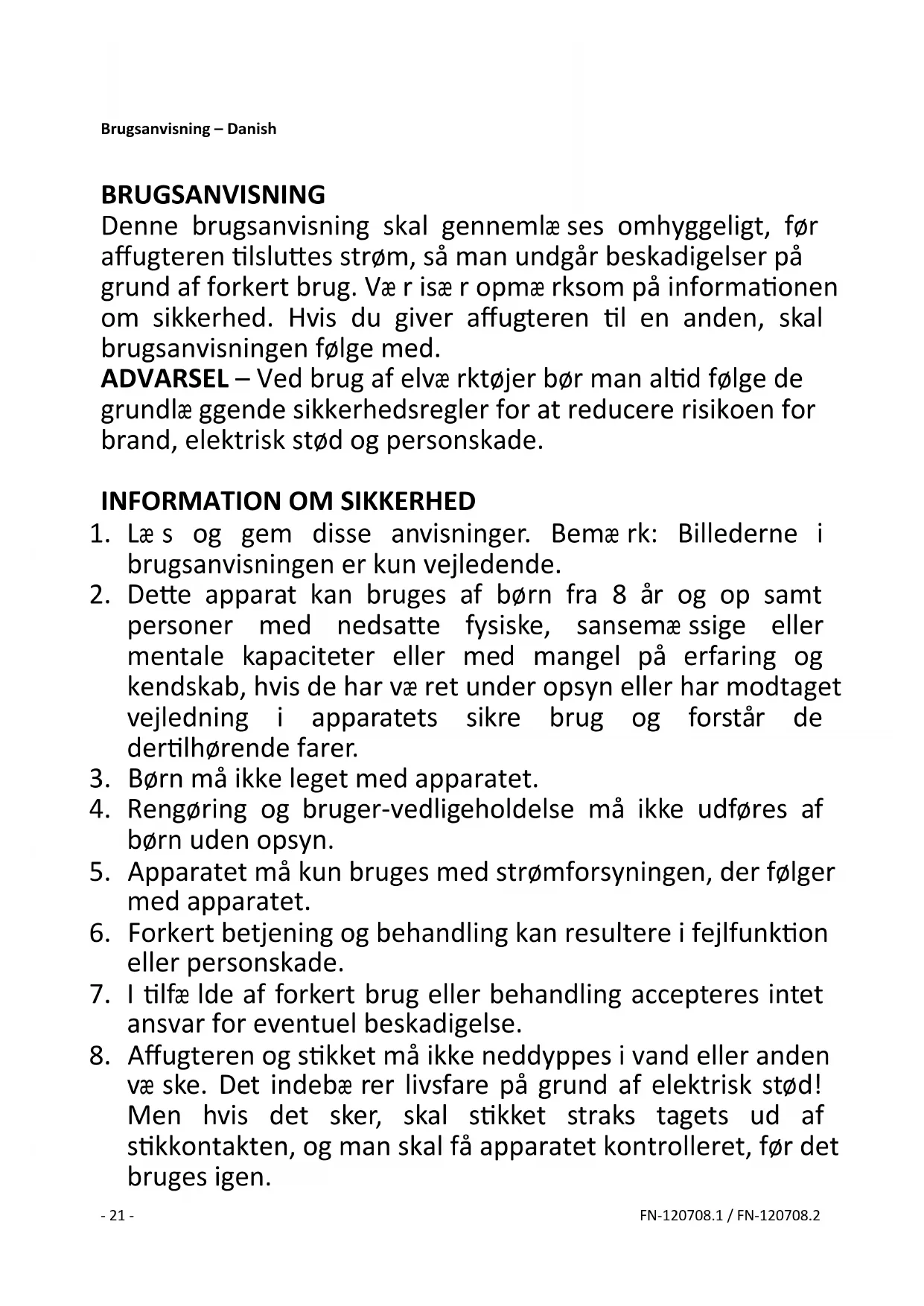 Pokud jde o informování spotřebitelů o tom, jak instalovat, používat a udržovat výrobek a informace o OEEZ, viz návod k obsluze dodaný s balením.- 21 - FN-120708.1 / FN-120708.2 Brugsanvisning – Danish BRUGSANVISNING Denne brugsanvisning skal gennemlæ ses omhyggeligt, før affugteren tilsluttes strøm, så man undgår beskadigelser på grund af forkert brug. Væ r isæ r opmæ rksom på informationen om sikkerhed. Hvis du giver affugteren til en anden, skal brugsanvisningen følge med. ADVARSEL – Ved brug af elvæ rktøjer bør man altid følge de grundlæ ggende sikkerhedsregler for at reducere risikoen for brand, elektrisk stød og personskade.