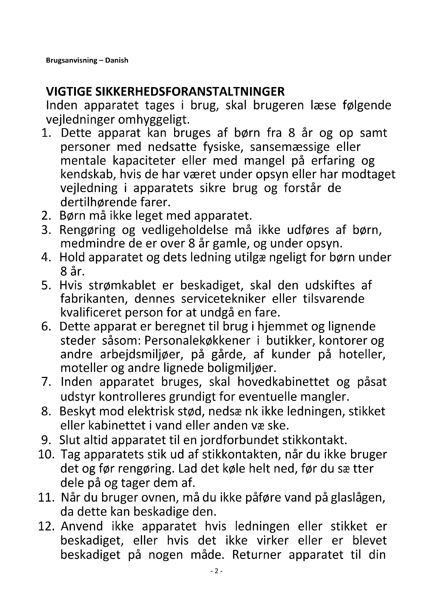 12. Anvend ikke apparatet hvis ledningen eller stikket er