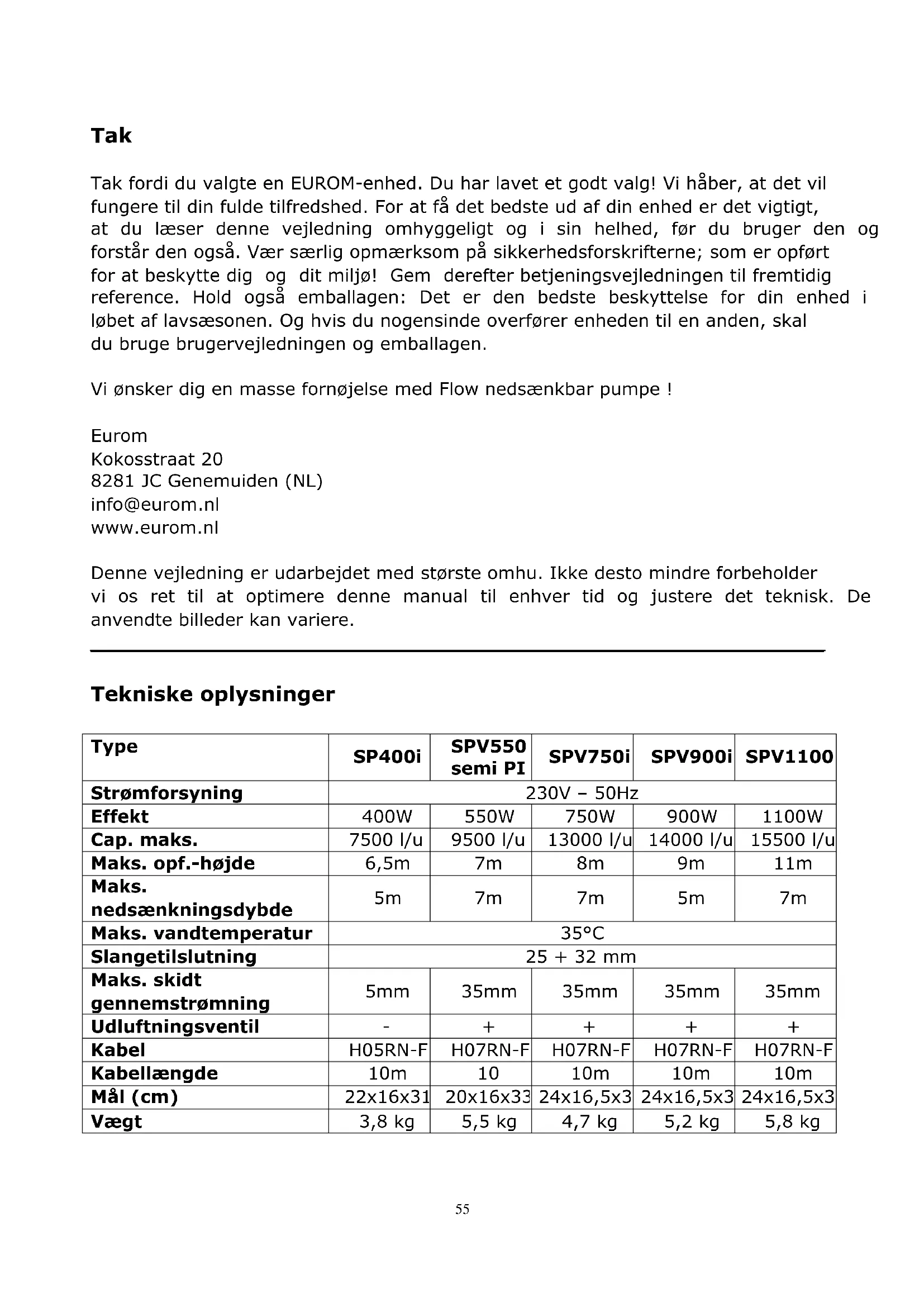 10m 10m 10m Mål (cm) 22x16x31 20x16x33 24x16,5x31 24x16,5x31 24x16,5x32 Vægt 3,8 kg 5,5 kg 4,7 kg 5,2 kg 5,8 kg56 Sikkerhedsanvisninger Kontroller din nye pumpe før brug (inkl. kabel og stik) for synlige skader. Tag ikke en beskadiget pumpe i brug, men bed din leverandør udskifte det. Af sikkerhedsårsager skal din nedsænkbare pumpe altid være tilsluttet en stikkontakt med jord, der er installeret i henhold til nationale forskrifter, er en del af en elektricitetsforsyning, der er sikret med maks. 16 ampere og udstyret med en jordudslagsafbryder (nominel spænding ≤30 mA). Kontroller din pumpe, strømkablet, stikket og stikkontakten før hver brug. Undgå brug, hvis du konstaterer beskadigelse, men få dem i stedet repareret af en autoriseret elektriker. Sørg for, at elektriske forbindelser altid holdes tørre. Undlad desuden at røre ved dem, med våde hænder. Kontroller før brug om stikkontakten, som du vil tilslutte pumpen til er egnet til pumpen (se typeskiltet). Beskyt strømkablet og stikket mod varme, olie og skarpe hjørner. Rengør drænslangen før brug. Kontroller før brug om pumpehøjden overstiger din pumpes kraft. Brug ikke strømkablet til ophængning, nedsænkning eller flytning af pumpen. Fastgør til det formål evt. et tov eller håndtag. Undlad desuden at trække i kablet for at fjerne stikket fra stikkontakten, tag i stedet fat direkte i stikket! Efter du har pumpet vand, der fx er blevet tilsat klor eller indeholder en vis mængde bundfald, skal du pumpen skylles med rent vand. Bemærk, at sand og alle andre slibende og ætsende stoffer fremskynder slid og påvirker pumpens ydelse. Undgå, at pumpen kører, når den af en eller anden grund ikke er i stand til at dræne vandet: blokeret dræn, for voldsom oppumpning osv. Det vil beskadige pumpen! Brug ikke pumpen, når personer befinder sig i det objekt, der skal tømmes af pumpen. Det er altid forbudt at bruge denne pumpe i et svømmebassin. Hvis pumpen kører tør, fremskynder det slitage og det fører til overophedning. Så undgå, at have pumpen kørende, hvis der ikke flyttes vand, og sluk omgående for den, hvis det skulle ske. Før du udfører inspektion eller rengøring af din pumpe, skal den slukkes ved at fjerne stikket fra stikkontakten.57 For at undgå personskade må du aldrig indføre fingre i pumpens sugeåbning, når stikket er i stikkontakten! Sørg for omhyggelig opsigt, når apparatet er aktiveret i nærheden af børn, handlingshæmmede personer eller husdyr. Dette apparatet er ikke egnet til brug af personer (inkl. børn) med en fysisk, sensorisk eller mental handicap eller manglende erfaring og viden, uanset om der er opsyn eller instruktion om brug af apparatet fra en person person, der er ansvarlig for deres sikkerhed. Hold enheden utilgængelig for børn, og lad dem aldrig være alene med apparatet. Når du vælger en placering for apparatet, skal du sikre dig, at den ikke er tilgængelig for børn. Der skal holdes øje med, at børn ikke leger med apparatet. Reparer aldrig pumpen, kablet og/eller stikket selv, men overlad det til en autoriseret specialist. Importør og fabrikant påtager sig intet ansvar for forkert udførte reparationer og/eller ændringer af pumpen. Sådanne indgreb vil desuden annullere garantien. Hvad er pumpen beregnet til? Denne nedsænkbare pumpe er designet til privat brug i og omkring hus og have. Nedsænkbare pumper bruges hovedsageligt til at pumpe vand væk, at flytte vand og dræning af vandreservoirer, kældre, både osv., samt til cirkulation af vand i en begrænset periode. OBS: Disse pumper må ikke anvendes i et svømmebassin! Pumperne er helt vandtætte og må nedsænkes i væske til en maksimal dybde på 5 til 7 meter (se teknisk beskrivelse). Den nedsænkbare pumpe er velegnet til følgende væsker: Type SPi: rent vand og sæbevand Type SPV og SPVi: sæbevand, rent og let beskidt vand. Ætsende, meget brandfarlige eller eksplosive væsker (såsom benzin, diesel, benzin, fortyndere osv.), fedt, olie, salt eller forurenet vand fra toiletter osv., må ikke pumpes! Bemærk, at sand og alle andre slibende og ætsende stoffer fremskynder slid og påvirker pumpens ydelse. Den pumpede væskes temperatur må ikke overstige 35 °C. Denne pumpe er ikke velegnet til konstant brug, som fx til at sikre konstant cirkulation af vand. Den type brug vil forkorte pumpens levetid betydeligt.58 Beskrivelse (model kan variere lidt)