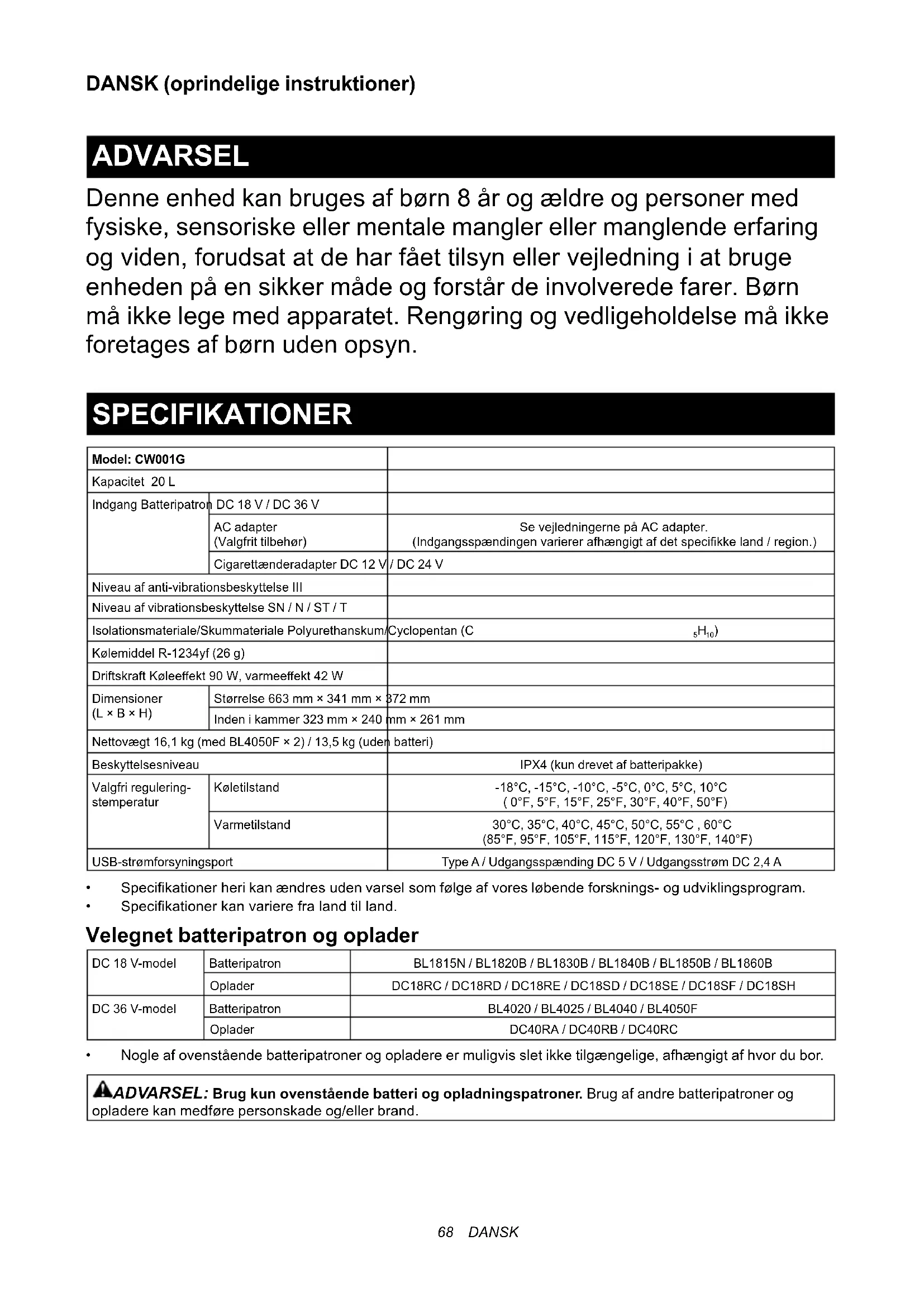 DANSK (oprindelige instruktioner) ADVARSEL Denne enhed kan bruges af børn 8 år og ældre og personer med fysiske, sensoriske eller mentale mangler eller manglende erfaring ogviden,forudsatatdeharfåettilsynellervejledningiatbruge enheden på en sikker måde og forstår de involverede farer. Børn må ikke lege med apparatet. Rengøring og vedligeholdelse må ikke foretages af børn uden opsyn. SPECIFIKATIONER Model: CW001GKapacitet 20 LIndgang Batteripatron DC 18 V / DC 36 VAC adapter (Valgfrit tilbehør)SevejledningernepåACadapter.(Indgangsspændingenvariererafhængigtafdetspecikkeland/region.)Cigarettænderadapter DC 12 V / DC 24 VNiveau af anti-vibrationsbeskyttelse IIINiveau af vibrationsbeskyttelse SN / N / ST / TIsolationsmateriale/Skummateriale Polyurethanskum/Cyclopentan (C