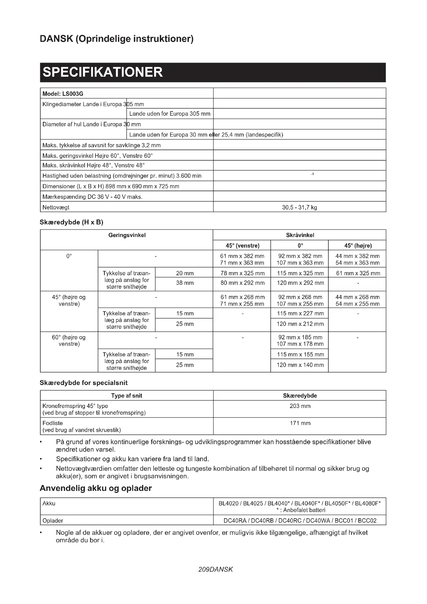 Dimensioner (L x B x H) 898 mm x 690 mm x 725 mm Mærkespænding DC 36 V - 40 V maks. Nettovægt 30,5 - 31,7 kg Skæredybde (H x B) Geringsvinkel Skråvinkel 45° (venstre) 0° 45° (højre) 0° - 61 mm x 382 mm 71 mm x 363 mm 92 mm x 382 mm 107 mm x 363 mm 44 mm x 382 mm 54 mm x 363 mm Tykkelse af træan- læg på anslag for større snithøjde 20 mm 78 mm x 325 mm 115 mm x 325 mm 61 mm x 325 mm 38 mm 80 mm x 292 mm 120 mm x 292 mm - 45° (højre og venstre) - 61 mm x 268 mm 71 mm x 255 mm 92 mm x 268 mm 107 mm x 255 mm 44 mm x 268 mm 54 mm x 255 mm Tykkelse af træan- læg på anslag for større snithøjde 15 mm - 115 mm x 227 mm - 25 mm 120 mm x 212 mm 60° (højre og venstre) - - 92 mm x 185 mm 107 mm x 178 mm