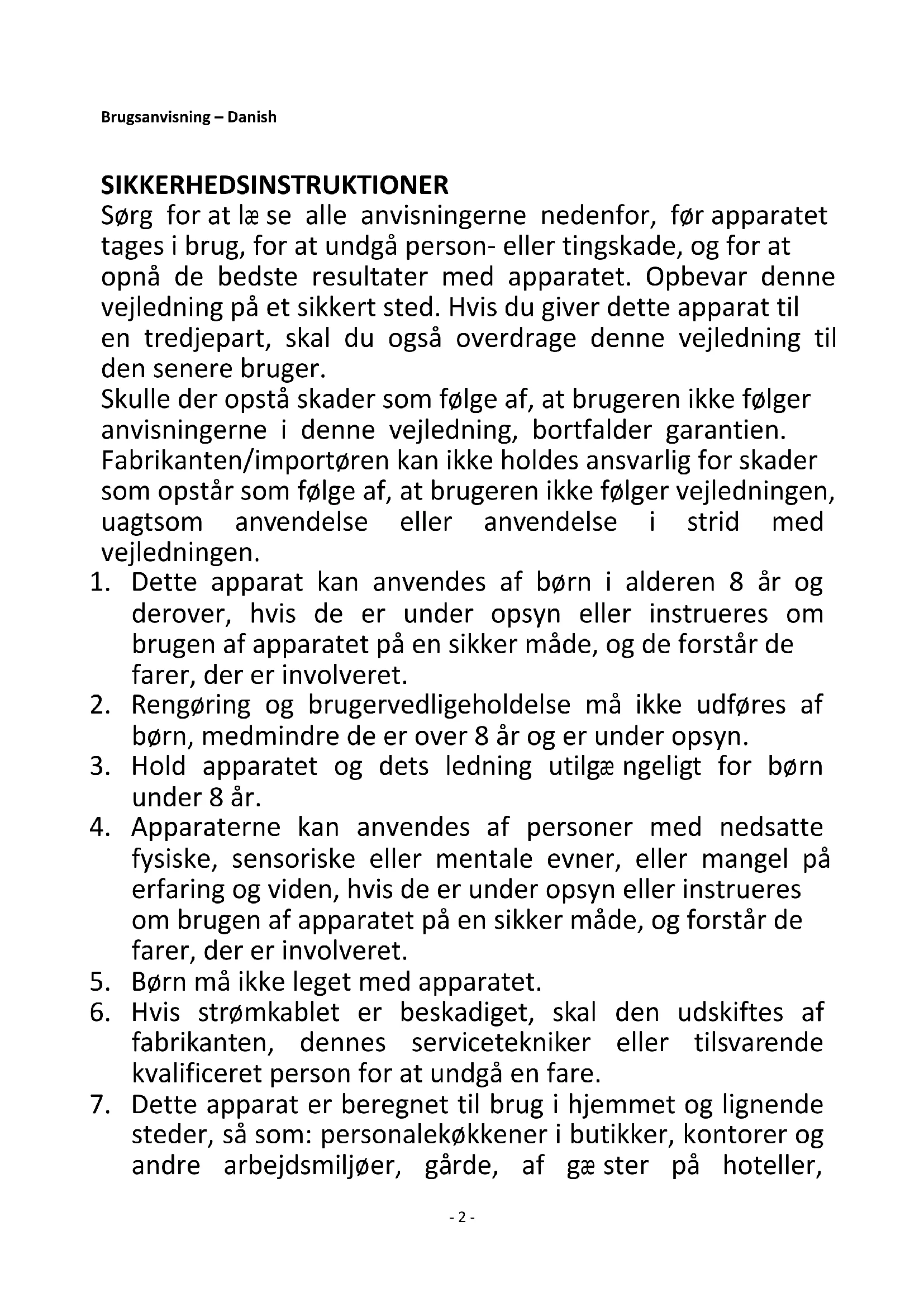 7. Dette apparat er beregnet til brug i hjemmet og lignende