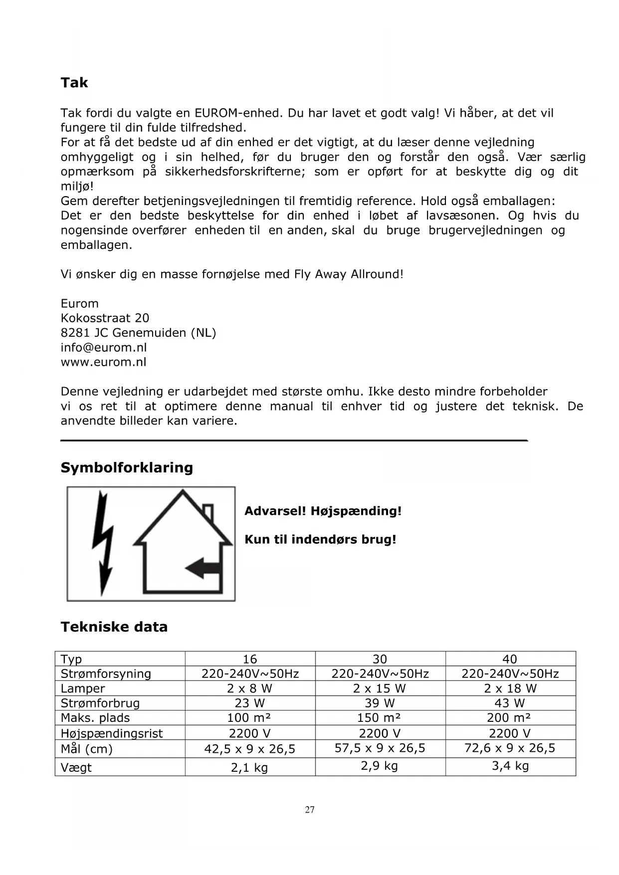Tak Tak fordi du valgte en EUROM-enhed. Du har lavet et godt valg! Vi håber, at det vil fungere til din fulde tilfredshed. For at få det bedste ud af din enhed er det vigtigt, at du læser denne vejledning omhyggeligt og i sin helhed, før du bruger den og forstår den også. Vær særlig opmærksom på sikkerhedsforskrifterne; som er opført for at beskytte dig og dit miljø! Gem derefter betjeningsvejledningen til fremtidig reference. Hold også emballagen: Det er den bedste beskyttelse for din enhed i løbet af lavsæsonen. Og hvis du nogensinde overfører enheden til en anden, skal du bruge brugervejledningen og emballagen. Vi ønsker dig en masse fornøjelse med Fly Away Allround! Eurom Kokosstraat 20 8281 JC Genemuiden (NL) info@eurom.nl www.eurom.nl Denne vejledning er udarbejdet med største omhu. Ikke desto mindre forbeholder vi os ret til at optimere denne manual til enhver tid og justere det teknisk. De anvendte billeder kan variere.
