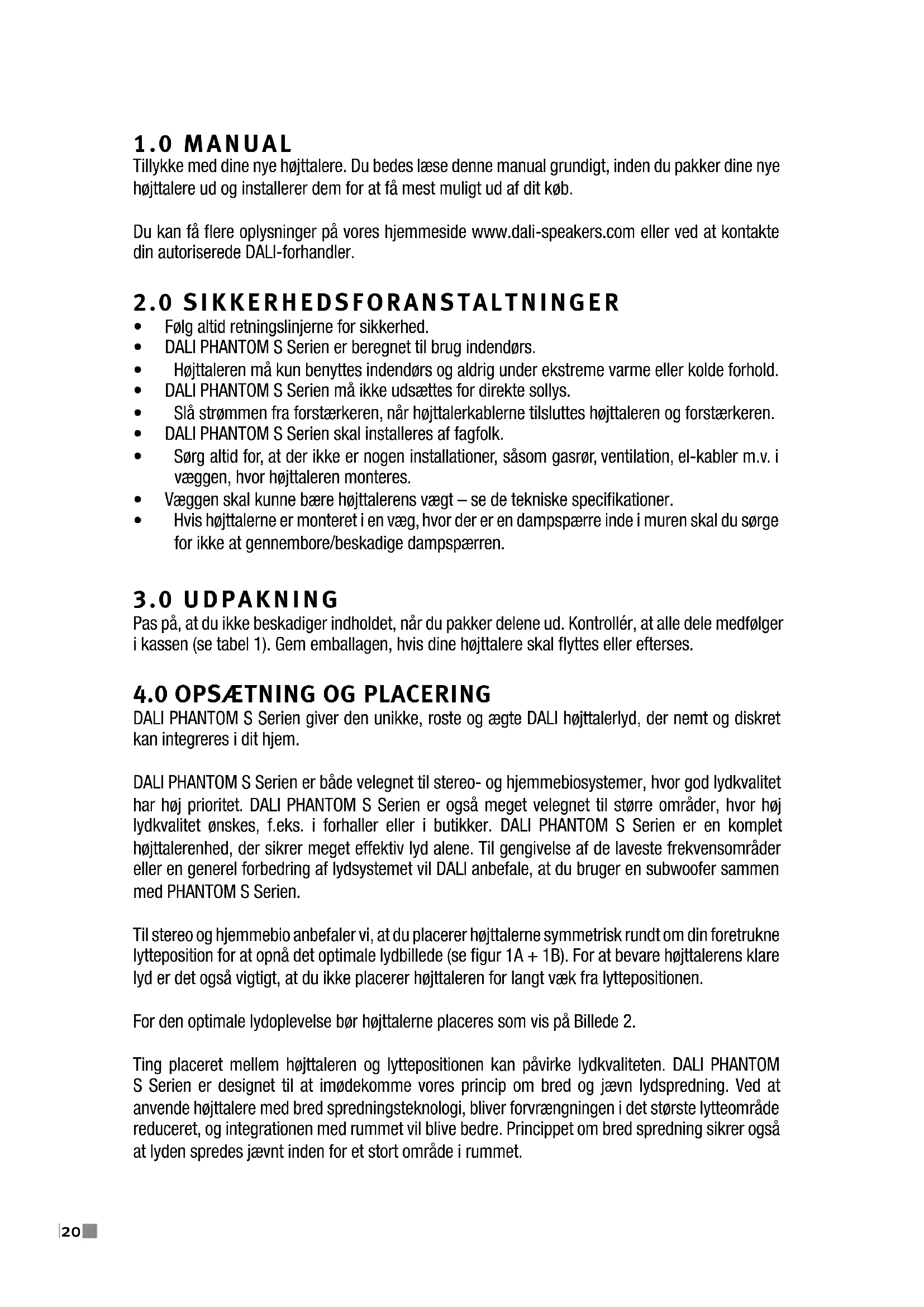 DALI PHANTOM S Serien giver den unikke, roste og ægte DALI højttalerlyd, der nemt og diskret kan integreres i dit hjem. DALI PHANTOM S Serien er både velegnet til stereo- og hjemmebiosystemer, hvor god lydkvalitet har høj prioritet. DALI PHANTOM S Serien er også meget velegnet til større områder, hvor høj lydkvalitet ønskes, f.eks. i forhaller eller i butikker. DALI PHANTOM S Serien er en komplet højttalerenhed, der sikrer meget effektiv lyd alene. Til gengivelse af de laveste frekvensområder eller en generel forbedring af lydsystemet vil DALI anbefale, at du bruger en subwoofer sammen med PHANTOM S Serien. Til stereo og hjemmebio anbefaler vi, at du placerer højttalerne symmetrisk rundt om din foretrukne lytteposition for at opnå det optimale lydbillede (se figur 1A + 1B). For at bevare højttalerens klare lyd er det også vigtigt, at du ikke placerer højttaleren for langt væk fra lyttepositionen. For den optimale lydoplevelse bør højttalerne placeres som vis på Billede 2. Ting placeret mellem højttaleren og lyttepositionen kan påvirke lydkvaliteten. DALI PHANTOM S Serien er designet til at imødekomme vores princip om bred og jævn lydspredning. Ved at anvende højttalere med bred spredningsteknologi, bliver forvrængningen i det største lytteområde reduceret, og integrationen med rummet vil blive bedre. Princippet om bred spredning sikrer også at lyden spredes jævnt inden for et stort område i rummet.21 UK DE DK CN FR Alle rum har deres egen særlige akustik, der påvirker vores oplevelse af lyd fra en højttaler. Lyden, du hører, består både af direkte lyd fra højttalerne og reflekteret lyd fra væggene. Sidstnævnte påvirker din oplevelse af lyden. Som hovedregel skal du prøve at undgå store, hårde og reflekterende områder i umiddelbar nærhed af dine højttalere, da det typisk vil forårsage stærke refleksioner, der kan forstyrre lydgengivelsens præcision og rumvirkning. Blødt inventar såsom gulvtæpper, gardiner m.v. kan hjælpe, hvis lyden er for klar. Både mængden og kvaliteten af den dybe bas afhænger af rummets størrelse og form og placeringen af højttalerne. Hvis højttalerne placeres i nærheden af en side eller bagvæg, fremhæves bassen. Hvis de placeres i et hjørne fremhæves den endnu mere, men det vil øge refleksionen.
