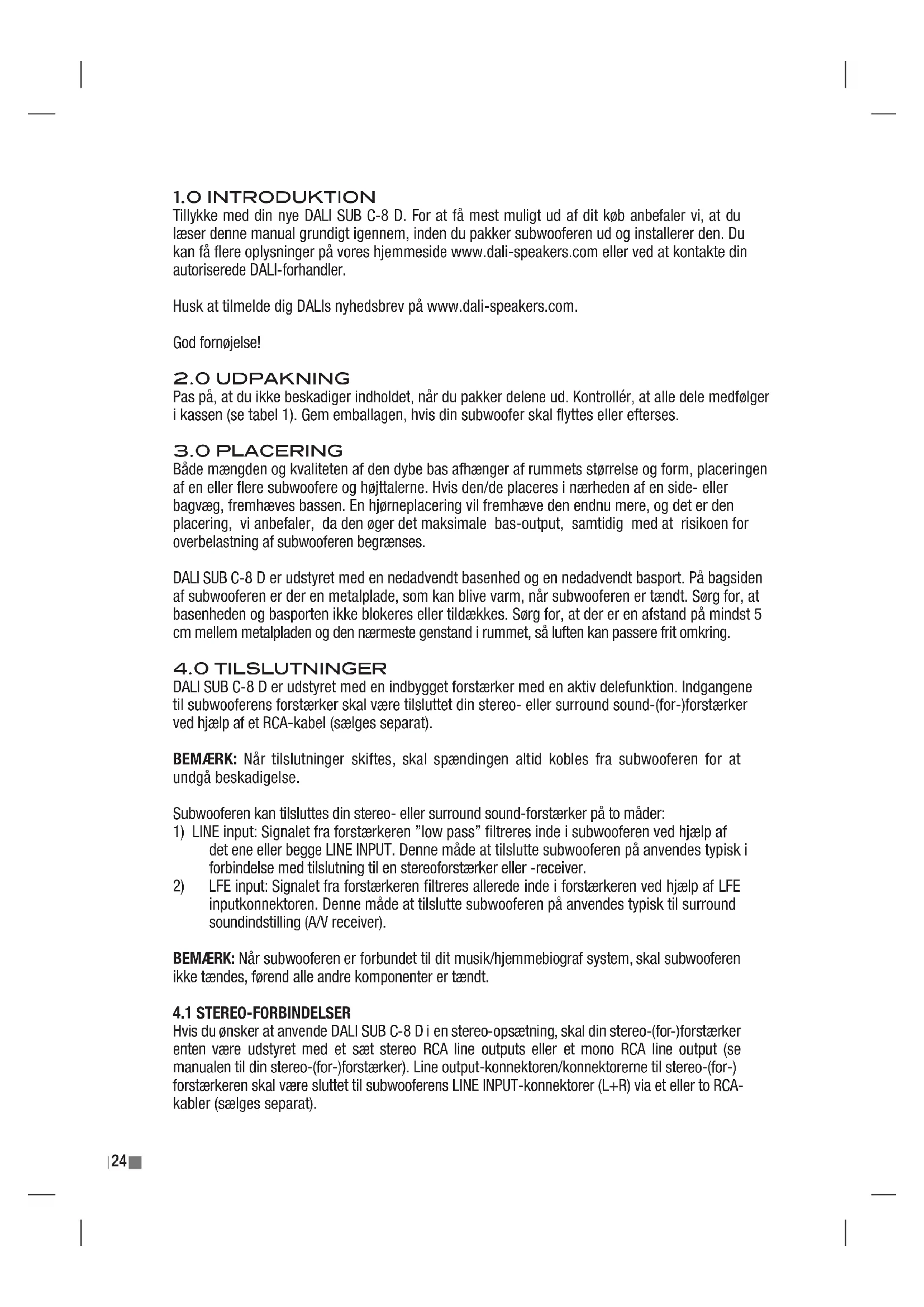 Tillykke med din nye DALI SUB C-8 D. For at få mest muligt ud af dit køb anbefaler vi, at du læser denne manual grundigt igennem, inden du pakker subwooferen ud og installerer den. Du kan få flere oplysninger på vores hjemmeside www.dali-speakers.com eller ved at kontakte din autoriserede DALI-forhandler. Husk at tilmelde dig DALIs nyhedsbrev på www.dali-speakers.com. God fornøjelse!