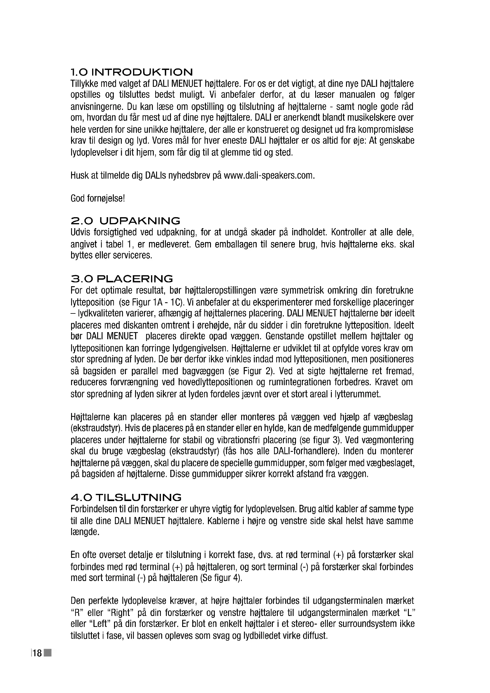 Tillykke med valget af DALI MENUET højttalere. For os er det vigtigt, at dine nye DALI højttalere opstilles og tilsluttes bedst muligt. Vi anbefaler derfor, at du læser manualen og følger anvisningerne. Du kan læse om opstilling og tilslutning af højttalerne - samt nogle gode råd om, hvordan du får mest ud af dine nye højttalere. DALI er anerkendt blandt musikelskere over hele verden for sine unikke højttalere, der alle er konstrueret og designet ud fra kompromisløse krav til design og lyd. Vores mål for hver eneste DALI højttaler er os altid for øje: At genskabe lydoplevelser i dit hjem, som får dig til at glemme tid og sted. Husk at tilmelde dig DALIs nyhedsbrev på www.dali-speakers.com. God fornøjelse!