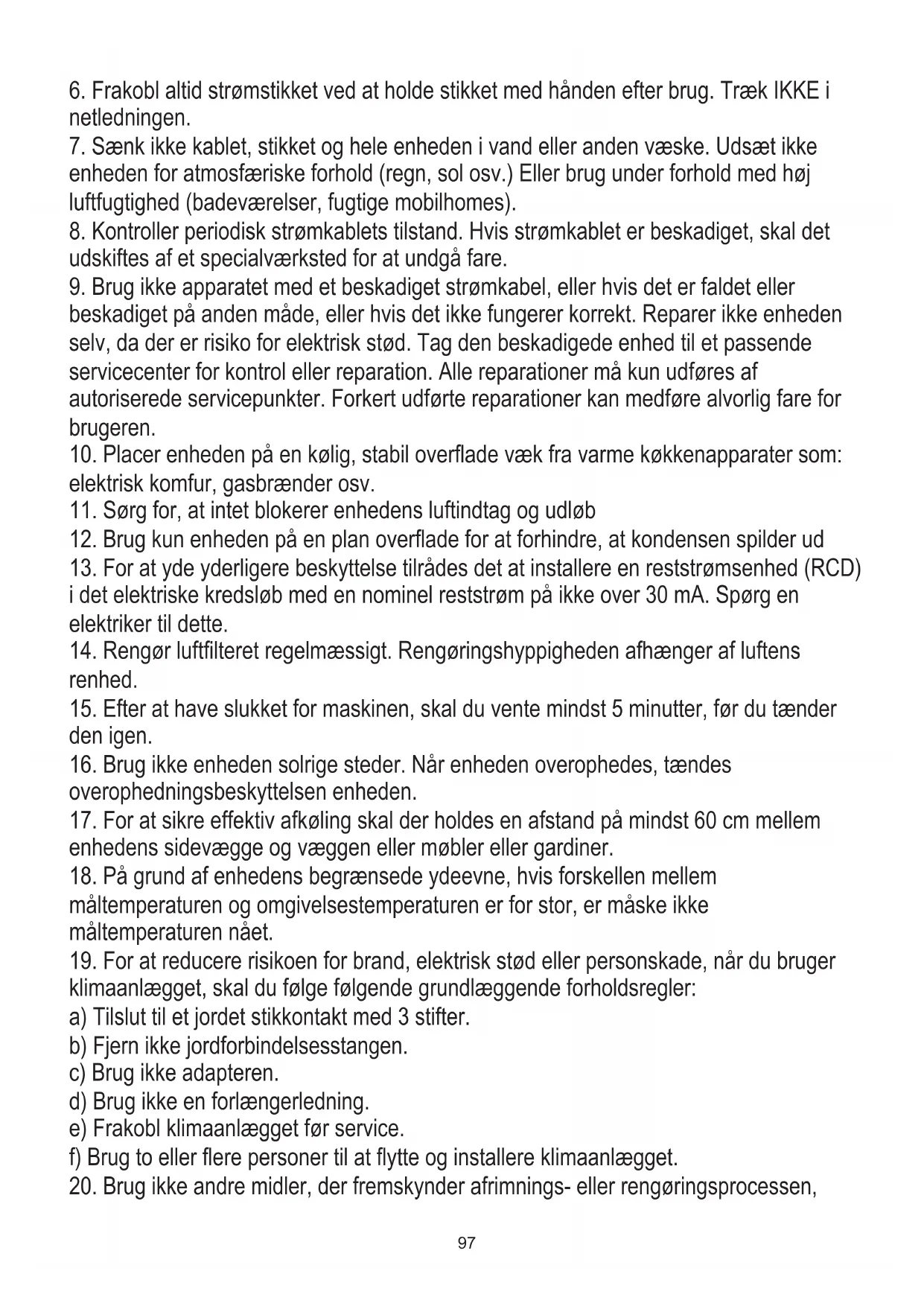 21. Enheden skal opbevares i et rum uden konstant drift af antændelseskilder, for