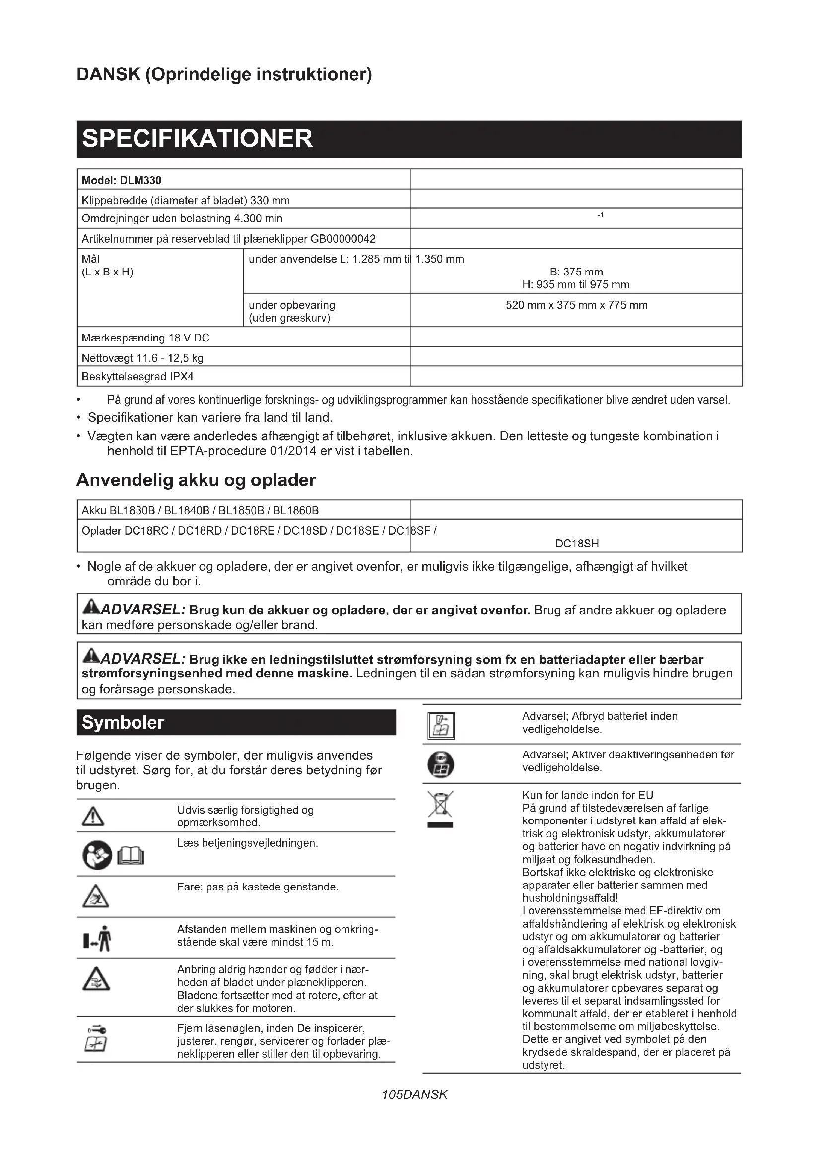 - Nogle af de akkuer og opladere, der er angivet ovenfor, er muligvis ikke tilgængelige, afhængigt af hvilket område du bor i. ADVARSEL: Brug kun de akkuer og opladere, der er angivet ovenfor. Brug af andre akkuer og opladere kan medføre personskade og/eller brand. ADVARSEL: Brug ikke en ledningstilsluttet strømforsyning som fx en batteriadapter eller bærbar strømforsyningsenhed med denne maskine. Ledningen til en sådan strømforsyning kan muligvis hindre brugen og forårsage personskade. Symboler Følgende viser de symboler, der muligvis anvendes til udstyret. Sørg for, at du forstår deres betydning før brugen. Udvis særlig forsigtighed og opmærksomhed. Læs betjeningsvejledningen. Fare; pas på kastede genstande. Afstanden mellem maskinen og omkring- stående skal være mindst 15 m. Anbring aldrig hænder og fødder i nær- heden af bladet under plæneklipperen. Bladene fortsætter med at rotere, efter at der slukkes for motoren. Fjern låsenøglen, inden De inspicerer, justerer, rengør, servicerer og forlader plæ- neklipperen eller stiller den til opbevaring. Advarsel; Afbryd batteriet inden vedligeholdelse. Advarsel; Aktiver deaktiveringsenheden før vedligeholdelse. Kun for lande inden for EU På grund af tilstedeværelsen af farlige komponenter i udstyret kan aald af elek- trisk og elektronisk udstyr, akkumulatorer og batterier have en negativ indvirkning på miljøet og folkesundheden. Bortskaf ikke elektriske og elektroniske apparater eller batterier sammen med husholdningsaald! I overensstemmelse med EF-direktiv om aaldshåndtering af elektrisk og elektronisk udstyr og om akkumulatorer og batterier og aaldsakkumulatorer og -batterier, og i overensstemmelse med national lovgiv- ning, skal brugt elektrisk udstyr, batterier og akkumulatorer opbevares separat og leveres til et separat indsamlingssted for kommunalt aald, der er etableret i henhold til bestemmelserne om miljøbeskyttelse. Dette er angivet ved symbolet på den krydsede skraldespand, der er placeret på udstyret.106 DANSK