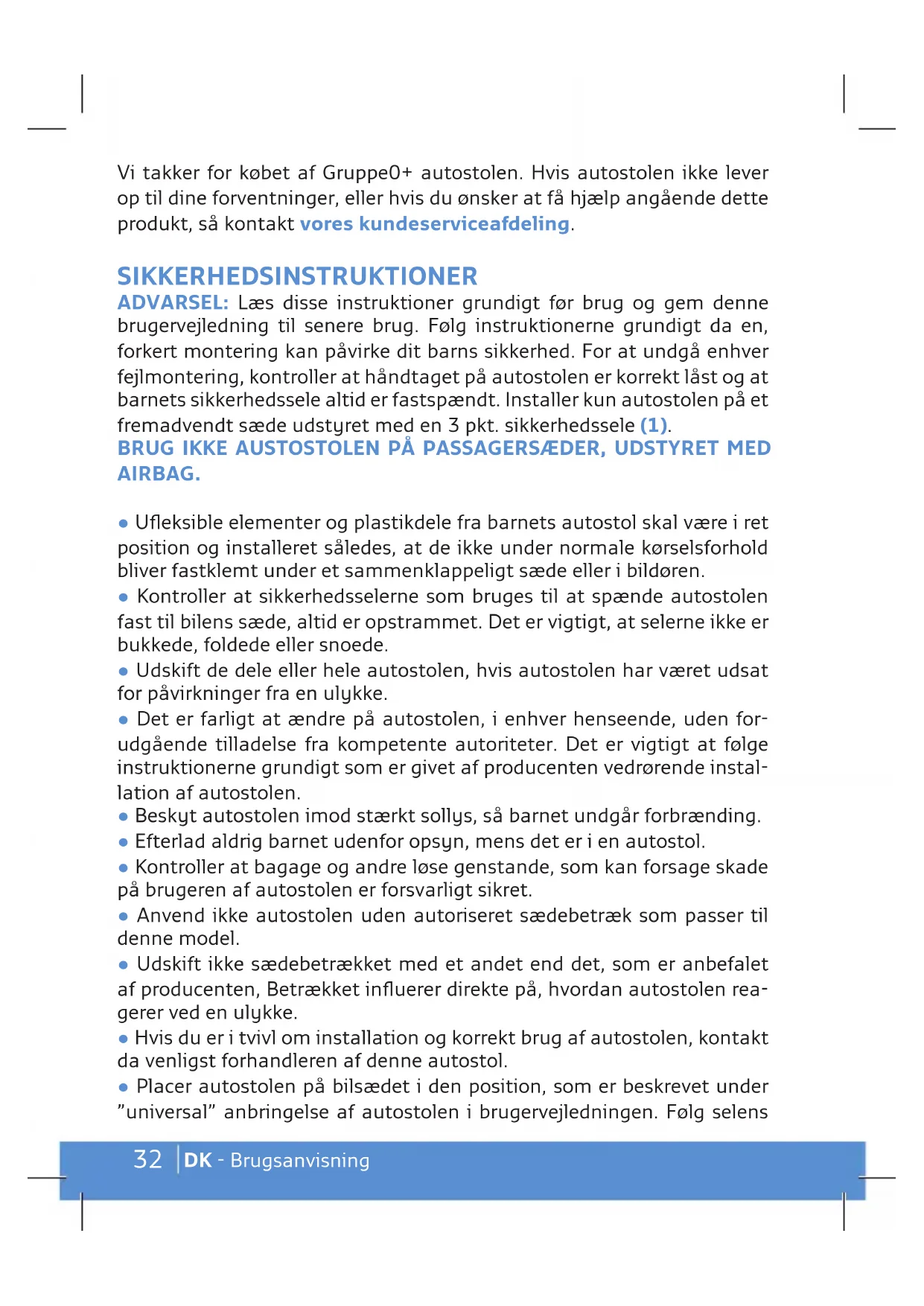 - En caso de dudas, contactar con el fabricante de la silla o con el distribui- dor.32 DK - Brugsanvisning Vi takker for købet af Gruppe0+ autostolen. Hvis autostolen ikke lever op til dine forventninger, eller hvis du ønsker at få hjælp angående dette produkt, så kontakt vores kundeserviceafdeling. SIKKERHEDSINSTRUKTIONER ADVARSEL: Læs disse instruktioner grundigt før brug og gem denne brugervejledning til senere brug. Følg instruktionerne grundigt da en, forkert montering kan påvirke dit barns sikkerhed. For at undgå enhver fejlmontering, kontroller at håndtaget på autostolen er korrekt låst og at barnets sikkerhedssele altid er fastspændt. Installer kun autostolen på et fremadvendt sæde udstyret med en 3 pkt. sikkerhedssele (1). BRUG IKKE AUSTOSTOLEN PÅ PASSAGERSÆDER, UDSTYRET MED AIRBAG.