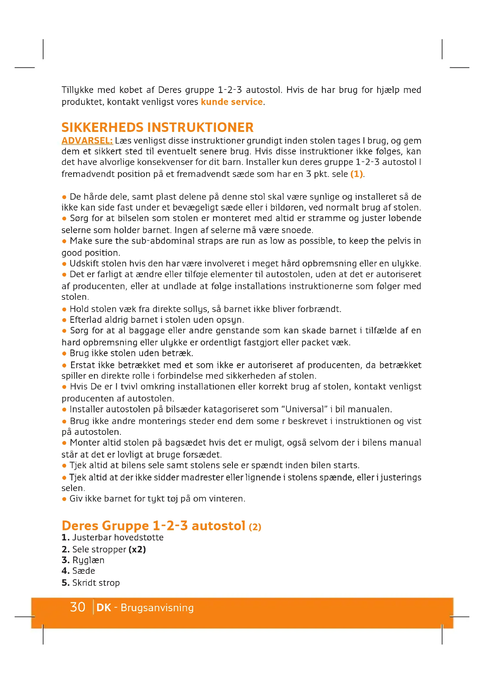 - En caso de duda, póngase en contacto con el fabricante del dispositivo de retención o con su distribuidor.30 DK - Brugsanvisning Tillykke med købet af Deres gruppe 1-2-3 autostol. Hvis de har brug for hjælp med produktet, kontakt venligst vores kunde service. SIKKERHEDS INSTRUKTIONER ADVARSEL: Læs venligst disse instruktioner grundigt inden stolen tages I brug, og gem dem et sikkert sted til eventuelt senere brug. Hvis disse instruktioner ikke følges, kan det have alvorlige konsekvenser for dit barn. Installer kun deres gruppe 1-2-3 autostol I fremadvendt position på et fremadvendt sæde som har en 3 pkt. sele (1).