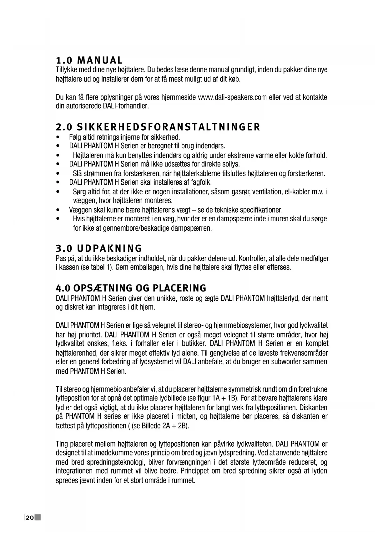 DALI PHANTOM H Serien giver den unikke, roste og ægte DALI PHANTOM højttalerlyd, der nemt og diskret kan integreres i dit hjem. DALI PHANTOM H Serien er lige så velegnet til stereo- og hjemmebiosystemer, hvor god lydkvalitet har høj prioritet. DALI PHANTOM H Serien er også meget velegnet til større områder, hvor høj lydkvalitet ønskes, f.eks. i forhaller eller i butikker. DALI PHANTOM H Serien er en komplet højttalerenhed, der sikrer meget effektiv lyd alene. Til gengivelse af de laveste frekvensområder eller en generel forbedring af lydsystemet vil DALI anbefale, at du bruger en subwoofer sammen med PHANTOM H Serien. Til stereo og hjemmebio anbefaler vi, at du placerer højttalerne symmetrisk rundt om din foretrukne lytteposition for at opnå det optimale lydbillede (se figur 1A + 1B). For at bevare højttalerens klare lyd er det også vigtigt, at du ikke placerer højttaleren for langt væk fra lyttepositionen. Diskanten på PHANTOM H series er ikke placeret i midten, og højttalerne bør placeres, så diskanten er tættest på lyttepositionen ( (se Billede 2A + 2B). Ting placeret mellem højttaleren og lyttepositionen kan påvirke lydkvaliteten. DALI PHANTOM er designet til at imødekomme vores princip om bred og jævn lydspredning. Ved at anvende højttalere med bred spredningsteknologi, bliver forvrængningen i det største lytteområde reduceret, og integrationen med rummet vil blive bedre. Princippet om bred spredning sikrer også at lyden spredes jævnt inden for et stort område i rummet.21 UK DE DK CN FR Alle rum har deres egen særlige akustik, der påvirker vores oplevelse af lyd fra en højttaler. Lyden, du hører, består både af direkte lyd fra højttalerne og reflekteret lyd fra et og væggene. Sidstnævnte påvirker din oplevelse af lyden. Som hovedregel skal du prøve at undgå store, hårde og reflekterende områder i umiddelbar nærhed af dine højttalere, da det typisk vil forårsage stærke refleksioner, der kan forstyrre lydgengivelsens præcision og rumvirkning. Blødt inventar såsom gulvtæpper, gardiner m.v. kan hjælpe, hvis lyden er for klar. Både mængden og kvaliteten af den dybe bas afhænger af rummets størrelse og form og placeringen af højttalerne. Hvis højttalerne placeres i nærheden af en side eller bagvæg, fremhæves bassen. Hvis de placeres i et hjørne fremhæves den endnu mere, men det vil øge refleksionen. BEMÆRK: Det flow dæmpende skummateriale på bagsiden af DALI PHANTOM H serien bør ikke afmonteres. Det bidrager til håndteringen af bas/mellemtone reproduktion ved at dæmpe resonans i rummet bagved højttaler enheden.