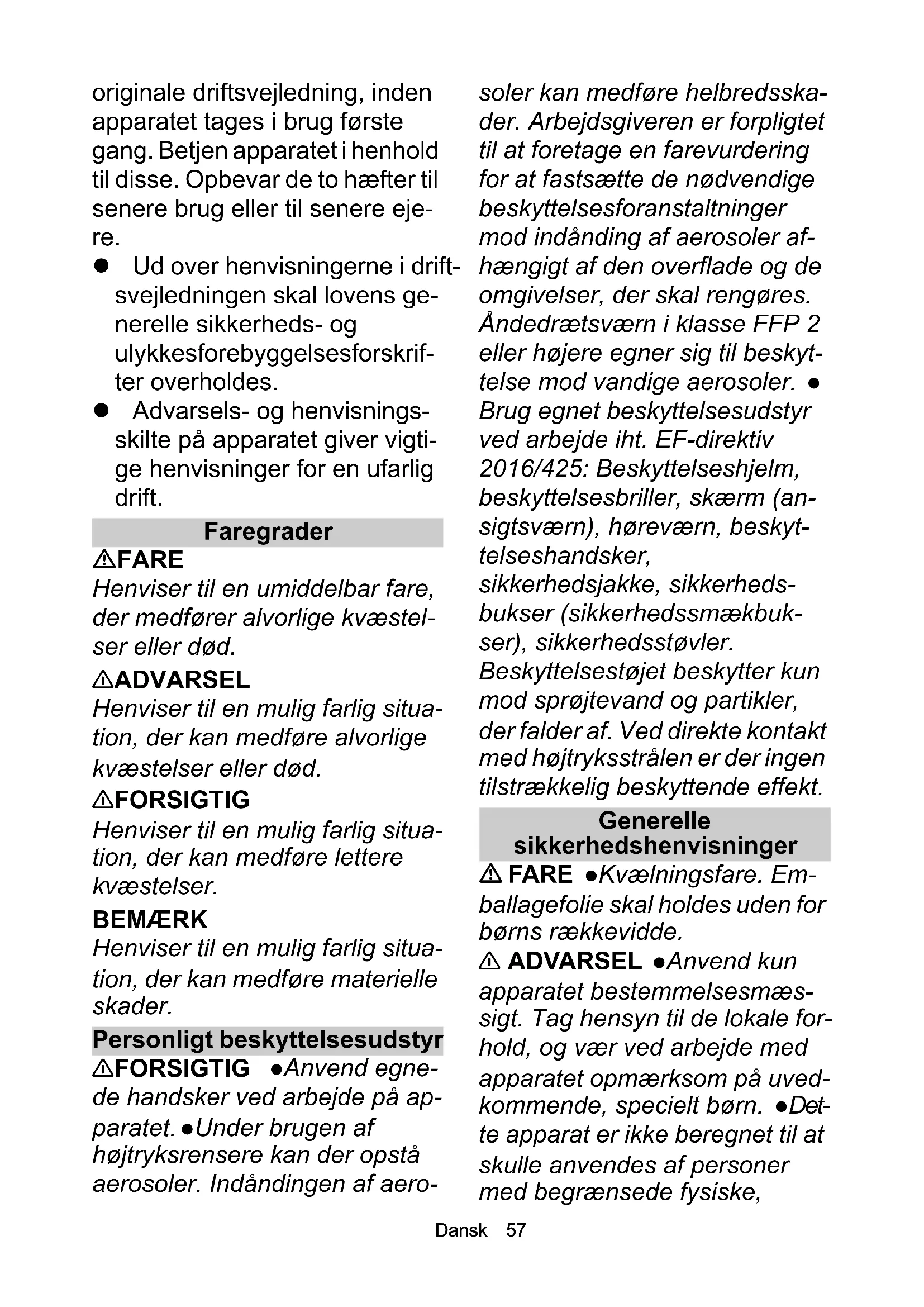 Brug egnet beskyttelsesudstyr ved arbejde iht. EF-direktiv 2016/425: Beskyttelseshjelm, beskyttelsesbriller, skærm (an- sigtsværn), høreværn, beskyt- telseshandsker, sikkerhedsjakke, sikkerheds- bukser (sikkerhedssmækbuk- ser), sikkerhedsstøvler. Beskyttelsestøjet beskytter kun mod sprøjtevand og partikler, der falder af. Ved direkte kontakt med højtryksstrålen er der ingen tilstrækkelig beskyttende effekt. Generelle sikkerhedshenvisninger FARE Kvælningsfare. Em- ballagefolie skal holdes uden for børns rækkevidde. 몇 ADVARSEL Anvend kun apparatet bestemmelsesmæs- sigt. Tag hensyn til de lokale for- hold, og vær ved arbejde med apparatet opmærksom på uved- kommende, specielt børn. Det- te apparat er ikke beregnet til at skulle anvendes af personer med begrænsede fysiske,58 Dansk sensoriske eller mentale evner eller mangel på erfaring og/eller mangel på viden. Apparatet må kun betjenes af personer, der er blevet undervist i håndte- ring af apparatet eller som har bevist deres evner til at betjene apparatet og udtrykkeligt har fået anvendelsen heraf til opga- ve. Børn skal være under op- syn for at sikre, at de ikke leger med maskinen. Børn og unge må ikke anvende apparatet. 몇 FORSIGTIG Sikkerheds- anordninger fungerer som din beskyttelse. Sikkerhedsanord- ninger må aldrig ændres eller ig- noreres. Fare for elektrisk stød FARE Tilslut kun apparater i beskyttelsesklasse I ved korrekt jordede strømkilder. Spæn- dingsangivelsen på typeskiltet skal stemme overens med strømkildens spænding. Vær opmærksom på stikkontaktens min. sikring, se kapitlet Tekniske data i driftsvejledningen. An- vend kun apparatet via et HFI- relæ/FI-relæ (maks. 30 mA). Forbind maskinen med det elek- triske net vha. et stik. En ikke- separerbar forbindelse med strømnettet er forbudt. Stikket anvendes til netseparation. Rør aldrig ved netstik og stik- kontakt med fugtige hænder. Netstik og kobling for en forlæn- gerledning skal være vandtætte og må ikke ligge i vandet. Kob- lingen må ikke ligge på gulvet. Anvend kabeltromler, der sikrer, at stikdåserne befinder sig mindst 60 mm over gulvet. Alle strømførende dele i arbejdsom- rådet skal være beskyttet mod vandstråler. Anvend kun stænkvandsbeskyttede forlæn- gerledninger med det min. tvær- snit, der er angivet i driftsvejledningen. Sørg for, at denne forbindelse ikke ligger i vandet. Maskinen må ikke ren- gøres med højtryks- eller lav- tryksvandstråle. 몇 ADVARSEL Tilslut kun ap- paratet ved en elektrisk tilslut- ning, der er blevet udført af en elinstallatør iht. IEC 60364-1. Kontroller nettilslutningslednin- gen med netstik for skader inden hver drift. Tag ikke et apparat i drift med beskadiget nettilslut- ningsledning. Lad straks en be- skadiget nettilslutningsledning udskifte af den autoriserede kundeservice / elinstallatør. Ødelæg eller beskadig ikke net- tilslutnings- eller forlængerled- ningen ved at køre over den, klemme den, rykke i den eller lignende. Beskyt nettilslutnings- ledningen mod varme, olie og skarpe kanter. Anvend kun den nettilslutningsledning, der fore- skrives af producenten, dette gælder også ved udskiftning afDansk 59 ledningen. Bestillingsnr. og type se Driftsvejledningen. Uegne- de elektriske forlængerledninger kan være farlige. Anvend derfor kun de godkendte og tilsvarende mærkede elektriske forlænger- ledninger med det tilstrækkelige ledningstværsnit udendørs. Udskift udelukkende koblinger på nettilslutnings- eller forlæn- gerledningen med koblinger, der har den samme vandtæthed og samme mekaniske fasthed. 몇 FORSIGTIG Sluk apparatet på hovedafbryderen / apparat- kontakten ved længere drifts- pauser og efter brug, og træk netstikket ud. BEMÆRK Tilkoblingsproces- ser producerer kortvarige spæn- dingsfald. Ved ugunstige netbetingelser kan der optræde påvirkninger på andre appara- ter. Ved en netimpedans under 0,15 ohm kan der ikke forventes forstyrrelser. Vandtilslutning 몇 ADVARSEL Forskruningen for alle tilslutningsslanger skal være tæt. Overskrid ikke den tilladte vandtilløbstemperatur. Læg slangeledningerne på en sikker måde. BEMÆRK Anvend kun slan- geledninger, der er i overens- stemmelse med kravene til driftstryk, mekanisk og kemisk belastning. Underskrid ikke den mindste tilladte bøjeradius for slangeledningerne. Udskift slangeledningerne i passende intervaller, også hvis der ikke kan ses mangler. Slangelednin- ger har en begrænset levetid. Overhold bestemmelserne fra vandforsyningsvirksomheden. Højtrykstilslutning FARE Anvend slangestrøm- per, beskyttelseslag eller af- skærmninger for at udelukke farer på grund af slangelednin- ger. 몇 ADVARSEL Apparatet må ikke tages i drift, hvis højtryks- slangen er beskadiget. Udskift straks en beskadiget højtryks- slange. Der må kun anvendes slanger og forbindelser, der an- befales af producenten. Bestil- lingsnr. se Driftsvejledningen.