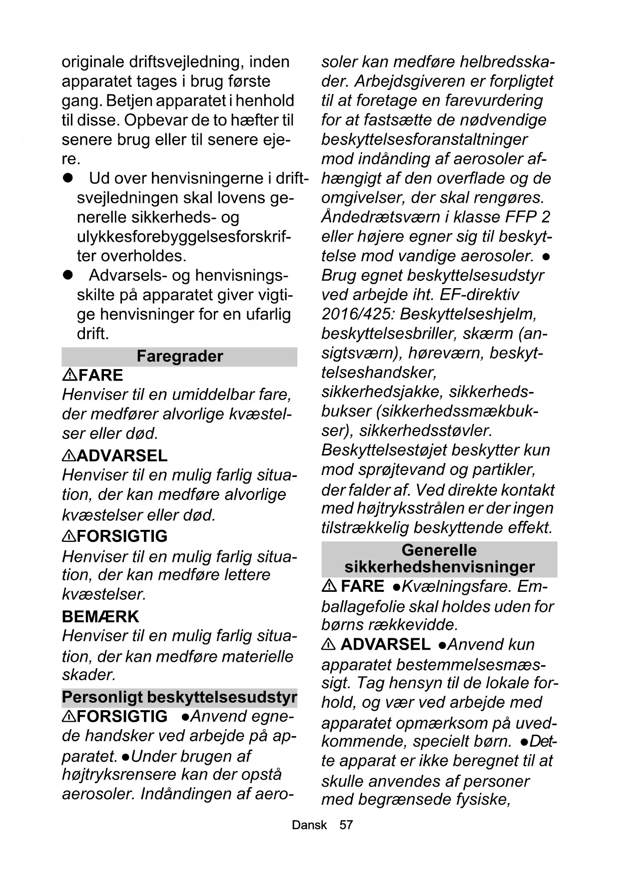 Brug egnet beskyttelsesudstyr ved arbejde iht. EF-direktiv 2016/425: Beskyttelseshjelm, beskyttelsesbriller, skærm (an- sigtsværn), høreværn, beskyt- telseshandsker, sikkerhedsjakke, sikkerheds- bukser (sikkerhedssmækbuk- ser), sikkerhedsstøvler. Beskyttelsestøjet beskytter kun mod sprøjtevand og partikler, der falder af. Ved direkte kontakt med højtryksstrålen er der ingen tilstrækkelig beskyttende effekt. Generelle sikkerhedshenvisninger FARE Kvælningsfare. Em- ballagefolie skal holdes uden for børns rækkevidde. 몇 ADVARSEL Anvend kun apparatet bestemmelsesmæs- sigt. Tag hensyn til de lokale for- hold, og vær ved arbejde med apparatet opmærksom på uved- kommende, specielt børn. Det- te apparat er ikke beregnet til at skulle anvendes af personer med begrænsede fysiske,58 Dansk sensoriske eller mentale evner eller mangel på erfaring og/eller mangel på viden. Apparatet må kun betjenes af personer, der er blevet undervist i håndte- ring af apparatet eller som har bevist deres evner til at betjene apparatet og udtrykkeligt har fået anvendelsen heraf til opga- ve. Børn skal være under op- syn for at sikre, at de ikke leger med maskinen. Børn og unge må ikke anvende apparatet. 몇 FORSIGTIG Sikkerheds- anordninger fungerer som din beskyttelse. Sikkerhedsanord- ninger må aldrig ændres eller ig- noreres. Fare for elektrisk stød FARE Tilslut kun apparater i beskyttelsesklasse I ved korrekt jordede strømkilder. Spæn- dingsangivelsen på typeskiltet skal stemme overens med strømkildens spænding. Vær opmærksom på stikkontaktens min. sikring, se kapitlet Tekniske data i driftsvejledningen. An- vend kun apparatet via et HFI- relæ/FI-relæ (maks. 30 mA). Forbind maskinen med det elek- triske net vha. et stik. En ikke- separerbar forbindelse med strømnettet er forbudt. Stikket anvendes til netseparation. Rør aldrig ved netstik og stik- kontakt med fugtige hænder. Netstik og kobling for en forlæn- gerledning skal være vandtætte og må ikke ligge i vandet. Kob- lingen må ikke ligge på gulvet. Anvend kabeltromler, der sikrer, at stikdåserne befinder sig mindst 60 mm over gulvet. Alle strømførende dele i arbejdsom- rådet skal være beskyttet mod vandstråler. Anvend kun stænkvandsbeskyttede forlæn- gerledninger med det min. tvær- snit, der er angivet i driftsvejledningen. Sørg for, at denne forbindelse ikke ligger i vandet. Maskinen må ikke ren- gøres med højtryks- eller lav- tryksvandstråle. 몇 ADVARSEL Tilslut kun ap- paratet ved en elektrisk tilslut- ning, der er blevet udført af en elinstallatør iht. IEC 60364-1. Kontroller nettilslutningslednin- gen med netstik for skader inden hver drift. Tag ikke et apparat i drift med beskadiget nettilslut- ningsledning. Lad straks en be- skadiget nettilslutningsledning udskifte af den autoriserede kundeservice / elinstallatør. Ødelæg eller beskadig ikke net- tilslutnings- eller forlængerled- ningen ved at køre over den, klemme den, rykke i den eller lignende. Beskyt nettilslutnings- ledningen mod varme, olie og skarpe kanter. Anvend kun den nettilslutningsledning, der fore- skrives af producenten, dette gælder også ved udskiftning afDansk 59 ledningen. Bestillingsnr. og type se Driftsvejledningen. Uegne- de elektriske forlængerledninger kan være farlige. Anvend derfor kun de godkendte og tilsvarende mærkede elektriske forlænger- ledninger med det tilstrækkelige ledningstværsnit udendørs. Udskift udelukkende koblinger på nettilslutnings- eller forlæn- gerledningen med koblinger, der har den samme vandtæthed og samme mekaniske fasthed. 몇 FORSIGTIG Sluk apparatet på hovedafbryderen / apparat- kontakten ved længere drifts- pauser og efter brug, og træk netstikket ud. BEMÆRK Tilkoblingsproces- ser producerer kortvarige spæn- dingsfald. Ved ugunstige netbetingelser kan der optræde påvirkninger på andre appara- ter. Ved en netimpedans under 0,15 ohm kan der ikke forventes forstyrrelser. Vandtilslutning 몇 ADVARSEL Forskruningen for alle tilslutningsslanger skal være tæt. Overskrid ikke den tilladte vandtilløbstemperatur. Læg slangeledningerne på en sikker måde. BEMÆRK Anvend kun slan- geledninger, der er i overens- stemmelse med kravene til driftstryk, mekanisk og kemisk belastning. Underskrid ikke den mindste tilladte bøjeradius for slangeledningerne. Udskift slangeledningerne i passende intervaller, også hvis der ikke kan ses mangler. Slangelednin- ger har en begrænset levetid. Overhold bestemmelserne fra vandforsyningsvirksomheden. Højtrykstilslutning FARE Anvend slangestrøm- per, beskyttelseslag eller af- skærmninger for at udelukke farer på grund af slangelednin- ger. 몇 ADVARSEL Apparatet må ikke tages i drift, hvis højtryks- slangen er beskadiget. Udskift straks en beskadiget højtryks- slange. Der må kun anvendes slanger og forbindelser, der an- befales af producenten. Bestil- lingsnr. se Driftsvejledningen.