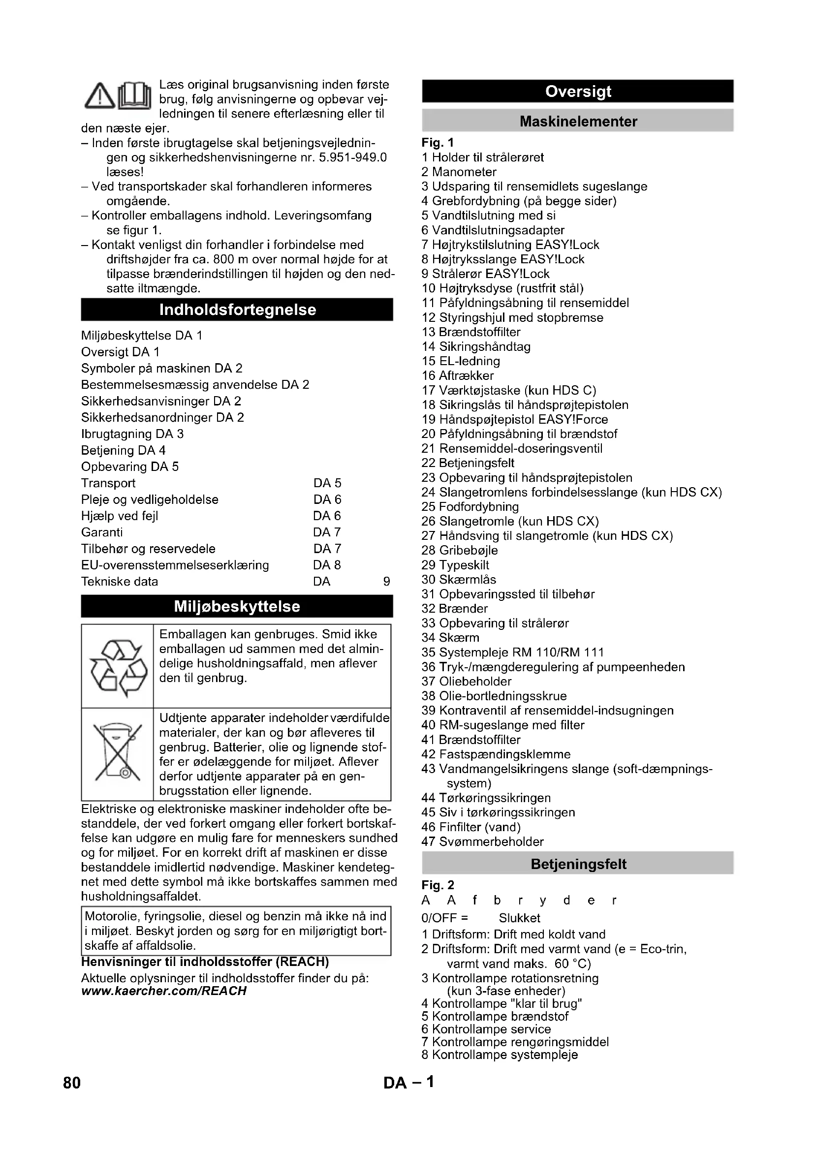 Peso de funcionamento típico, C kg 118,1 118,1 121,1 Peso de funcionamento típico, CX kg 121 121 124 Tanque de combustível l 15,5 15,5 15,5 Reservatório de detergente l 15,5 15,5 15,5 79PT– 1 Læs original brugsanvisning inden første brug, følg anvisningerne og opbevar vej- ledningen til senere efterlæsning eller til den næste ejer. – Inden første ibrugtagelse skal betjeningsvejlednin- gen og sikkerhedshenvisningerne nr. 5.951-949.0 læses! – Ved transportskader skal forhandleren informeres omgående. – Kontroller emballagens indhold. Leveringsomfang se figur 1. – Kontakt venligst din forhandler i forbindelse med driftshøjder fra ca. 800 m over normal højde for at tilpasse brænderindstillingen til højden og den ned- satte iltmængde. Elektriske og elektroniske maskiner indeholder ofte be- standdele, der ved forkert omgang eller forkert bortskaf- felse kan udgøre en mulig fare for menneskers sundhed og for miljøet. For en korrekt drift af maskinen er disse bestanddele imidlertid nødvendige. Maskiner kendeteg- net med dette symbol må ikke bortskaffes sammen med husholdningsaffaldet. Henvisninger til indholdsstoffer (REACH) Aktuelle oplysninger til indholdsstoffer finder du på: www.kaercher.com/REACH Fig. 1 1 Holder til strålerøret 2 Manometer 3 Udsparing til rensemidlets sugeslange 4 Grebfordybning (på begge sider) 5 Vandtilslutning med si 6 Vandtilslutningsadapter 7 Højtrykstilslutning EASY!Lock 8 Højtryksslange EASY!Lock 9 Strålerør EASY!Lock 10 Højtryksdyse (rustfrit stål) 11 Påfyldningsåbning til rensemiddel 12 Styringshjul med stopbremse 13 Brændstoffilter 14 Sikringshåndtag 15 EL-ledning 16 Aftrækker 17 Værktøjstaske (kun HDS C) 18 Sikringslås til håndsprøjtepistolen 19 Håndspøjtepistol EASY!Force 20 Påfyldningsåbning til brændstof 21 Rensemiddel-doseringsventil 22 Betjeningsfelt 23 Opbevaring til håndsprøjtepistolen 24 Slangetromlens forbindelsesslange (kun HDS CX) 25 Fodfordybning 26 Slangetromle (kun HDS CX) 27 Håndsving til slangetromle (kun HDS CX) 28 Gribebøjle 29 Typeskilt 30 Skærmlås 31 Opbevaringssted til tilbehør 32 Brænder 33 Opbevaring til strålerør 34 Skærm 35 Systempleje RM 110/RM 111 36 Tryk-/mængderegulering af pumpeenheden 37 Oliebeholder 38 Olie-bortledningsskrue 39 Kontraventil af rensemiddel-indsugningen 40 RM-sugeslange med filter 41 Brændstoffilter 42 Fastspændingsklemme 43 Vandmangelsikringens slange (soft-dæmpnings- system) 44 Tørkøringssikringen 45 Siv i tørkøringssikringen 46 Finfilter (vand) 47 Svømmerbeholder Fig. 2 AAfbryder 1 Driftsform: Drift med koldt vand 2 Driftsform: Drift med varmt vand (e = Eco-trin, varmt vand maks. 60 °C) 3 Kontrollampe rotationsretning (kun 3-fase enheder) 4 Kontrollampe "klar til brug" 5 Kontrollampe brændstof 6 Kontrollampe service 7 Kontrollampe rengøringsmiddel 8 Kontrollampe systempleje Indholdsfortegnelse Miljøbeskyttelse DA 1 Oversigt DA 1 Symboler på maskinen DA 2 Bestemmelsesmæssig anvendelse DA 2 Sikkerhedsanvisninger DA 2 Sikkerhedsanordninger DA 2 Ibrugtagning DA 3 Betjening DA 4 Opbevaring DA 5 Transport DA 5 Pleje og vedligeholdelse DA 6 Hjælp ved fejl DA 6 Garanti DA 7 Tilbehør og reservedele DA 7 EU-overensstemmelseserklæring DA 8 Tekniske data DA 9 Miljøbeskyttelse Emballagen kan genbruges. Smid ikke emballagen ud sammen med det almin- delige husholdningsaffald, men aflever den til genbrug. Udtjente apparater indeholder værdifulde materialer, der kan og bør afleveres til genbrug. Batterier, olie og lignende stof- fer er ødelæggende for miljøet. Aflever derfor udtjente apparater på en gen- brugsstation eller lignende. Motorolie, fyringsolie, diesel og benzin må ikke nå ind i miljøet. Beskyt jorden og sørg for en miljørigtigt bort- skaffe af affaldsolie. Oversigt Maskinelementer Betjeningsfelt 0/OFF = Slukket 80 DA– 2 – Betjeningselementer til rengøringsprocessen er bul. – Betjeningselementer til vedligeholdelse og service er lysegrå. Højtryksstråler kan være farlige, hvis de ikke anvendes korrekt. Strålen må ikke rettes mod personer, dyr, tændt elektrisk udstyr eller mod højtryksrenseren. Rensning af: Maskiner, køretøjer, bygninger, værktøj, facader, terrasser, haveredskaber, etc. FARE Fysisk Risiko! Ved brug på tankstationer eller andre ri- sikoområder skal der tages hensyn til de tilsvarende sik- kerhedsregler. Krav til vandets kvalitet: BEMÆRK Der må kun bruges rent vand som højtryksmedium. Til- smudsninger fører til for tidligt slid eller aflejringer på maskinen og tilbehøret. Hvis der anvendes recyclingvand, må følgende græn- seværdier ikke overskrides. – De pågældende nationale love til væskestrålere skal overholdes. – De pågældende nationale love til forebyggelse imod ulykkestilfælde skal overholdes. Væskestrå- lere skal kontrolleres regelmæssigt og resultaterne fra kontrollen skal skiftligt dokumenteres. – Maskinens opvarmningsindretning er et fyringsan- læg. Fyringsanlæg skal kontrolleres regelmæssigt iht. de pågældende nationale love. – Der må ikke foretages ændringer på maskinen/til- behøret. Sikkerhedsanordningerne tjener brugerens beskyttelse og må ikke sættes ud af drift eller ignoreres i deres funk- tion. – Ved reducering af vandmængden på pumpehove- det eller med servopress-reguleringen åbnes over- strømningsventilen og en del af vandet flyder tilba- ge til pumpesugesiden. – Hvis pistolen låses, sådan at alt vand flyder tilbage til pumpesugesiden, slukker trykomstilleren på overstrømningsventilen for pumpen. – Hvis sprøjetepistolen åbnes igen, tændes pumpen igen fra trykomstilleren på pumpens cylinderhove- de. Af fabrik er overstrømningsventilen indstillet og plombe- ret. Indstilling foretages udelukkende fra kundeservice. – Sikkerhedsventilen åbnes hvis overstrømnings- ventilen respektive trykkontakten er defekt. Af fabrik er sikkerhedsventilen indstillet og plomberet. Indstilling foretages udelukkende fra kundeservice. 