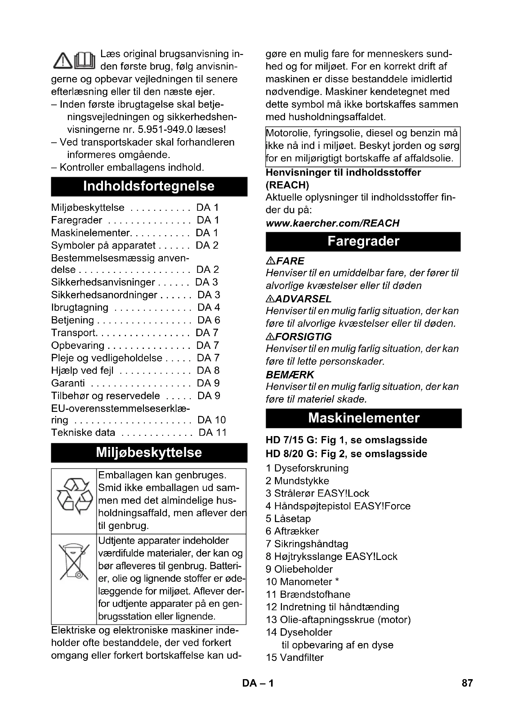 0,6 0,7 86 PT– 1 Læs original brugsanvisning in- den første brug, følg anvisnin- gerne og opbevar vejledningen til senere efterlæsning eller til den næste ejer. – Inden første ibrugtagelse skal betje- ningsvejledningen og sikkerhedshen- visningerne nr. 5.951-949.0 læses! – Ved transportskader skal forhandleren informeres omgående. – Kontroller emballagens indhold. Elektriske og elektroniske maskiner inde- holder ofte bestanddele, der ved forkert omgang eller forkert bortskaffelse kan ud- gøre en mulig fare for menneskers sund- hed og for miljøet. For en korrekt drift af maskinen er disse bestanddele imidlertid nødvendige. Maskiner kendetegnet med dette symbol må ikke bortskaffes sammen med husholdningsaffaldet. Henvisninger til indholdsstoffer (REACH) Aktuelle oplysninger til indholdsstoffer fin- der du på: www.kaercher.com/REACH FARE Henviser til en umiddelbar fare, der fører til alvorlige kvæstelser eller til døden 몇 ADVARSEL Henviser til en mulig farlig situation, der kan føre til alvorlige kvæstelser eller til døden. 몇 FORSIGTIG Henviser til en mulig farlig situation, der kan føre til lette personskader. BEMÆRK Henviser til en mulig farlig situation, der kan føre til materiel skade. 1 Dyseforskruning 2 Mundstykke 3 Strålerør EASY!Lock 4 Håndspøjtepistol EASY!Force 5 Låsetap 6 Aftrækker 7 Sikringshåndtag 8 Højtryksslange EASY!Lock 9 Oliebeholder 10 Manometer * 11 Brændstofhane 12 Indretning til håndtænding 13 Olie-aftapningsskrue (motor) 14 Dyseholder til opbevaring af en dyse 15 Vandfilter Indholdsfortegnelse Miljøbeskyttelse . . . . . . . . . . . DA 1 Faregrader . . . . . . . . . . . . . . . DA 1 Maskinelementer. . . . . . . . . . . DA 1 Symboler på apparatet . . . . . . DA 2 Bestemmelsesmæssig anven- delse . . . . . . . . . . . . . . . . . . . . DA 2 Sikkerhedsanvisninger . . . . . . DA 3 Sikkerhedsanordninger . . . . . . DA 3 Ibrugtagning . . . . . . . . . . . . . . DA 4 Betjening . . . . . . . . . . . . . . . . . DA 6 Transport. . . . . . . . . . . . . . . . . DA 7 Opbevaring . . . . . . . . . . . . . . . DA 7 Pleje og vedligeholdelse . . . . . DA 7 Hjælp ved fejl . . . . . . . . . . . . . DA 8 Garanti . . . . . . . . . . . . . . . . . . DA 9 Tilbehør og reservedele . . . . . DA 9 EU-overensstemmelseserklæ- ring . . . . . . . . . . . . . . . . . . . . . DA 10 Tekniske data . . . . . . . . . . . . . DA 11 Miljøbeskyttelse Emballagen kan genbruges. Smid ikke emballagen ud sam- men med det almindelige hus- holdningsaffald, men aflever den til genbrug. Udtjente apparater indeholder værdifulde materialer, der kan og bør afleveres til genbrug. Batteri- er, olie og lignende stoffer er øde- læggende for miljøet. Aflever der- for udtjente apparater på en gen- brugsstation eller lignende. Motorolie, fyringsolie, diesel og benzin må ikke nå ind i miljøet. Beskyt jorden og sørg for en miljørigtigt bortskaffe af affaldsolie. Faregrader Maskinelementer HD 7/15 G: Fig 1, se omslagsside HD 8/20 G: Fig 2, se omslagsside 87DA– 2 16 Rengøringsmiddel-sugeslange med ju- sterbart filter (doseringsventil) 17 Vandtilslutning 18 Olieaftapningsskrue pumpe 19 Højtrykstilslutning EASY!Lock 20 Olieinspektionsglas * 21 Tryk-/mængderegulering * 22 Strålerør-opbevaring 23 Højtrykspumpe 24 Oliemålestang (motor) 25 Motor 26 Motorafbryder 27 Benzintank 28 Stjernegreb skydebøjle 29 Holder til håndsprøjtepistolen 30 Slangeholder 31 Bøjle A Omløbermøtrik B Filterkop C O-Ring D Filterindsats