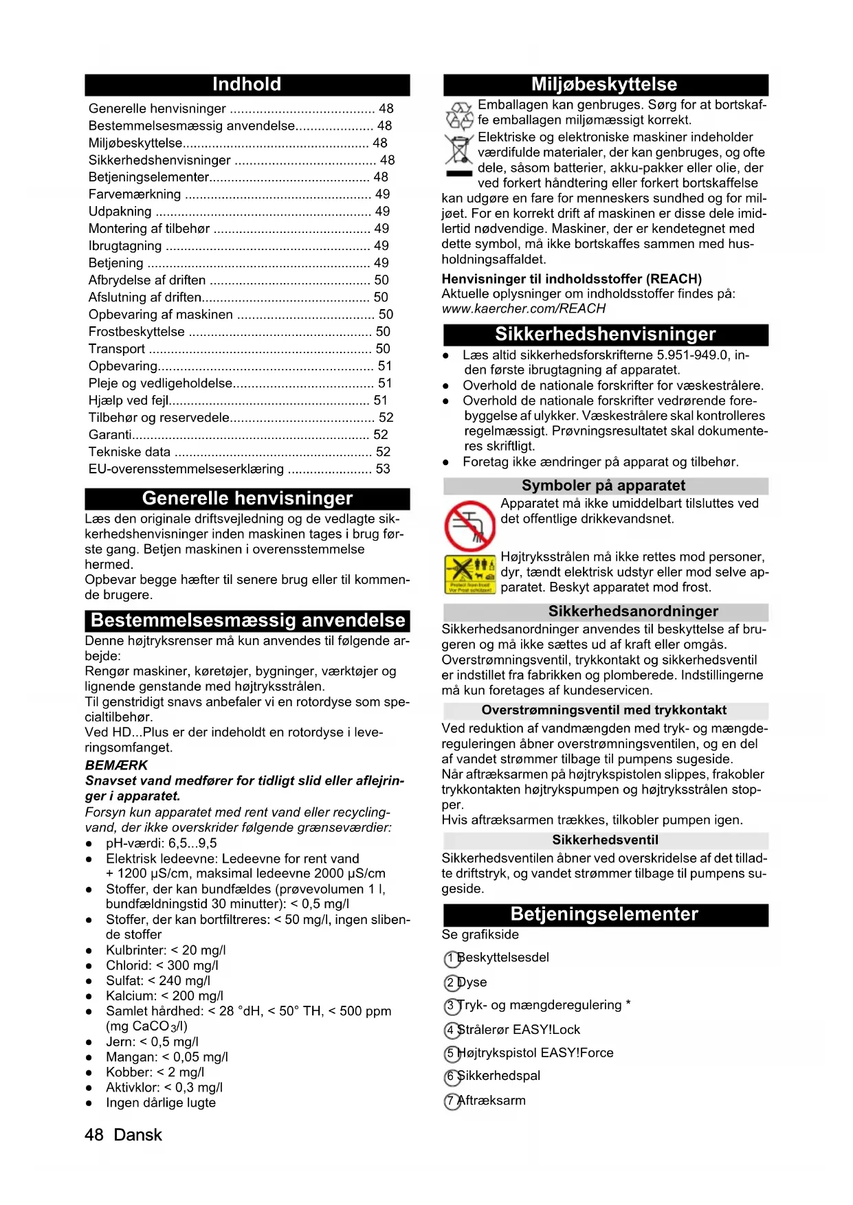 - /l) ● Jern: < 0,5 mg/l ● Mangan: < 0,05 mg/l ● Kobber: < 2 mg/l ● Aktivklor: < 0,3 mg/l ● Ingen dårlige lugte Miljøbeskyttelse Emballagen kan genbruges. Sørg for at bortskaf- fe emballagen miljømæssigt korrekt. Elektriske og elektroniske maskiner indeholder værdifulde materialer, der kan genbruges, og ofte dele, såsom batterier, akku-pakker eller olie, der ved forkert håndtering eller forkert bortskaffelse kan udgøre en fare for menneskers sundhed og for mil- jøet. For en korrekt drift af maskinen er disse dele imid- lertid nødvendige. Maskiner, der er kendetegnet med dette symbol, må ikke bortskaffes sammen med hus- holdningsaffaldet. Henvisninger til indholdsstoffer (REACH) Aktuelle oplysninger om indholdsstoffer findes på: www.kaercher.com/REACH Sikkerhedshenvisninger ● Læs altid sikkerhedsforskrifterne 5.951-949.0, in- den første ibrugtagning af apparatet. ● Overhold de nationale forskrifter for væskestrålere. ● Overhold de nationale forskrifter vedrørende fore- byggelse af ulykker. Væskestrålere skal kontrolleres regelmæssigt. Prøvningsresultatet skal dokumente- res skriftligt. ● Foretag ikke ændringer på apparat og tilbehør. Symboler på apparatet Apparatet må ikke umiddelbart tilsluttes ved det offentlige drikkevandsnet. Højtryksstrålen må ikke rettes mod personer, dyr, tændt elektrisk udstyr eller mod selve ap- paratet. Beskyt apparatet mod frost. Sikkerhedsanordninger Sikkerhedsanordninger anvendes til beskyttelse af bru- geren og må ikke sættes ud af kraft eller omgås. Overstrømningsventil, trykkontakt og sikkerhedsventil er indstillet fra fabrikken og plomberede. Indstillingerne må kun foretages af kundeservicen. Overstrømningsventil med trykkontakt Ved reduktion af vandmængden med tryk- og mængde- reguleringen åbner overstrømningsventilen, og en del af vandet strømmer tilbage til pumpens sugeside. Når aftræksarmen på højtrykspistolen slippes, frakobler trykkontakten højtrykspumpen og højtryksstrålen stop- per. Hvis aftræksarmen trækkes, tilkobler pumpen igen. Sikkerhedsventil Sikkerhedsventilen åbner ved overskridelse af det tillad- te driftstryk, og vandet strømmer tilbage til pumpens su- geside. Betjeningselementer Se grafikside 1 Beskyttelsesdel 2 Dyse 3 Tryk- og mængderegulering * 4 Strålerør EASY!Lock 5 Højtrykspistol EASY!Force 6 Sikkerhedspal 7 Aftræksarm Generelle henvisninger p. 48