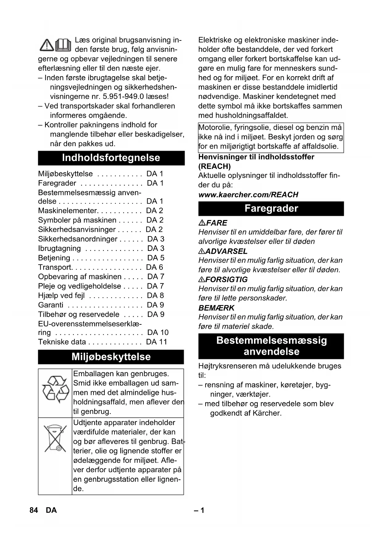 dB(A) 93 97 96 83PT– 1 Læs original brugsanvisning in- den første brug, følg anvisnin- gerne og opbevar vejledningen til senere efterlæsning eller til den næste ejer. – Inden første ibrugtagelse skal betje- ningsvejledningen og sikkerhedshen- visningerne nr. 5.951-949.0 læses! – Ved transportskader skal forhandleren informeres omgående. – Kontroller pakningens indhold for manglende tilbehør eller beskadigelser, når den pakkes ud. Elektriske og elektroniske maskiner inde- holder ofte bestanddele, der ved forkert omgang eller forkert bortskaffelse kan ud- gøre en mulig fare for menneskers sund- hed og for miljøet. For en korrekt drift af maskinen er disse bestanddele imidlertid nødvendige. Maskiner kendetegnet med dette symbol må ikke bortskaffes sammen med husholdningsaffaldet. Henvisninger til indholdsstoffer (REACH) Aktuelle oplysninger til indholdsstoffer fin- der du på: www.kaercher.com/REACH FARE Henviser til en umiddelbar fare, der fører til alvorlige kvæstelser eller til døden 몇 ADVARSEL Henviser til en mulig farlig situation, der kan føre til alvorlige kvæstelser eller til døden. 몇 FORSIGTIG Henviser til en mulig farlig situation, der kan føre til lette personskader. BEMÆRK Henviser til en mulig farlig situation, der kan føre til materiel skade. Højtryksrenseren må udelukkende bruges til: – rensning af maskiner, køretøjer, byg- ninger, værktøjer. – med tilbehør og reservedele som blev godkendt af Kärcher. Indholdsfortegnelse Miljøbeskyttelse . . . . . . . . . . . DA 1 Faregrader . . . . . . . . . . . . . . . DA 1 Bestemmelsesmæssig anven- delse . . . . . . . . . . . . . . . . . . . . DA 1 Maskinelementer. . . . . . . . . . . DA 2 Symboler på maskinen . . . . . . DA 2 Sikkerhedsanvisninger . . . . . . DA 2 Sikkerhedsanordninger . . . . . . DA 3 Ibrugtagning . . . . . . . . . . . . . . DA 3 Betjening . . . . . . . . . . . . . . . . . DA 5 Transport. . . . . . . . . . . . . . . . . DA 6 Opbevaring af maskinen . . . . . DA 7 Pleje og vedligeholdelse . . . . . DA 7 Hjælp ved fejl . . . . . . . . . . . . . DA 8 Garanti . . . . . . . . . . . . . . . . . . DA 9 Tilbehør og reservedele . . . . . DA 9 EU-overensstemmelseserklæ- ring . . . . . . . . . . . . . . . . . . . . . DA 10 Tekniske data . . . . . . . . . . . . . DA 11 Miljøbeskyttelse Emballagen kan genbruges. Smid ikke emballagen ud sam- men med det almindelige hus- holdningsaffald, men aflever den til genbrug. Udtjente apparater indeholder værdifulde materialer, der kan og bør afleveres til genbrug. Bat- terier, olie og lignende stoffer er ødelæggende for miljøet. Afle- ver derfor udtjente apparater på en genbrugsstation eller lignen- de. Motorolie, fyringsolie, diesel og benzin må ikke nå ind i miljøet. Beskyt jorden og sørg for en miljørigtigt bortskaffe af affaldsolie. Faregrader Bestemmelsesmæssig anvendelse 84 DA– 2 Se figurerne på side 2 1 Håndspøjtepistol EASY!Force 2 Låsetap 3 Aftrækker 4 Sikringshåndtag 5 Drejekobling (ikke ved HD 16/15-4 Cage) 6 Højtryksslange EASY!Lock 7 Driftstimetæller (option) 8 Strålerør-opbevaring 9 Bøjle 10 Slange-/kabelholder 11 Afbryder 12 Prop 13 Kontrollampe Funktionstilstand / Fejl 14 Nettilslutningskabel med stik 15 Olie påfyldningsstuds (oliebeholder ved HD 25/15-4) 16 Vandtilslutning med filter 17 Tryk-/mængderegulering 18 Rum til tilbehør 19 Olie-bortledningsskrue 20 Oliestandsmåler 21 Højtrykstilslutning EASY!Lock 22 Manometer 23 Støtte til kranbelæsning 24 Powermundstykke med omløbermøtrik 25 Strålerør EASY!Lock 26 Servo-Press-drejeregulator – Betjeningselementer til rengøringspro- cessen er bul. – Betjeningselementer til vedligeholdelse og service er lysegrå. 몇 ADVARSEL Læg mærke til vandforsyningsselskabets reglementer. Ifølge de gældende love, må ma- skinen aldrig anvendes på drikke- vandsnettet uden en systemsepa- rator. Der skal anvendes en veleg- net systemseparator fra KÄRCHER eller en alternativ systemseparator ifølge EN 12729 type BA. Vand, som strømmer igennem en system- separator, kan ikke drikkes. 몇 FORSIGTIG Tilslut aldrig en systemadskiller direkte til maskinen, men til drikkevandsforsyningen. FARE Fysisk Risiko! – Der bør kun bruges originale højtryks- slanger. – Højtryksslangen og sprøjteindretningen skal være egnet til den maksimale drift- stryk som angives i de tekniske data. – Undgå kontakt med kemikalier. – Kontroller højtryksslangen dagligt. Knækkede slanger må ikke længere bruges. Hvis det øverste trådlag er synligt, må højtryksslangen ikke længere bruges. – Brug ingen højtryksslanger med beska- diget gevind. – Højtryksslangen lægges således ned, at den ikke kan køres over. Maskinelementer Farvekodning Symboler på maskinen Højttryksstråler kan være farlige, hvis de ikke an- vendes korrekt. Strålen må ikke rettes mod per- soner, dyr, tændt elek- trisk udstyr eller mod sel- ve maskinen. Fare for materiel skade på grund af frysende vand! Maskinen skal op- bevares eller tømmes i et frostfrit rum om vinteren. Sikkerhedsanvisninger 85DA– 3 – Brug ingen højtryksslange som blev kørt over, knækket eller udsat for stød, selvom skader ikke er synligt. – Opbevar højtryksslangen således, at der ikke kan opstå mekaniske belast- ninger. – Der må ikke foretages ændringer på maskinen/tilbehøret. Sikkerhedsanordningerne tjener brugerens beskyttelse og må ikke sættes ud af drift og deres funktion må ikke omgås. Det forhindrer en tilfældig start af renseren. Ved pauser eller hvis arbejdet er afsluttet bør renseren afbrydes. Låsetappen på pistolgrebet forhindrer util- sigtet tilkobling af højtryksrenseren. – Ved reducering af vandmængden med tryk-/mængdereguleringen åbnes over- strømningsventilen og en del af vandet flyder tilbage til pumpesugesiden. – Hvis håndsprøjtepistolen lukkes, åbnes overløbsventilen og den samlede vand- mængde strømmer tilbage til pumpens sugeside. Trykafbryderen på overl